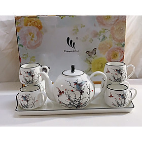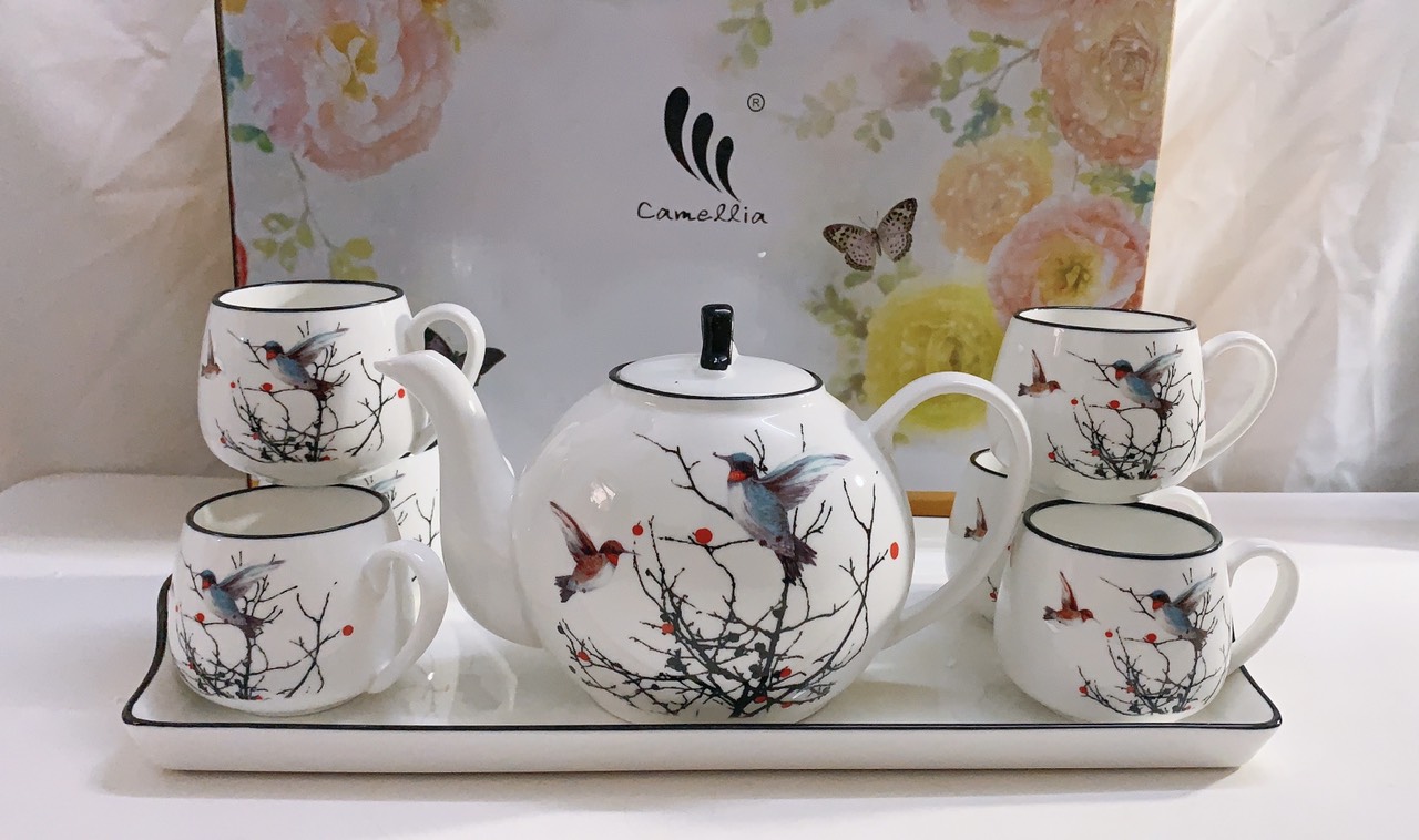 Một bộ sản phẩm bao gồm: 01 ấm, 01 đĩa ấm, 06 chén và 06 đĩa chén. Bộ sản phẩm được làm từ chất liệu gốm cao cấp, bảo đảm an toàn vệ sinh