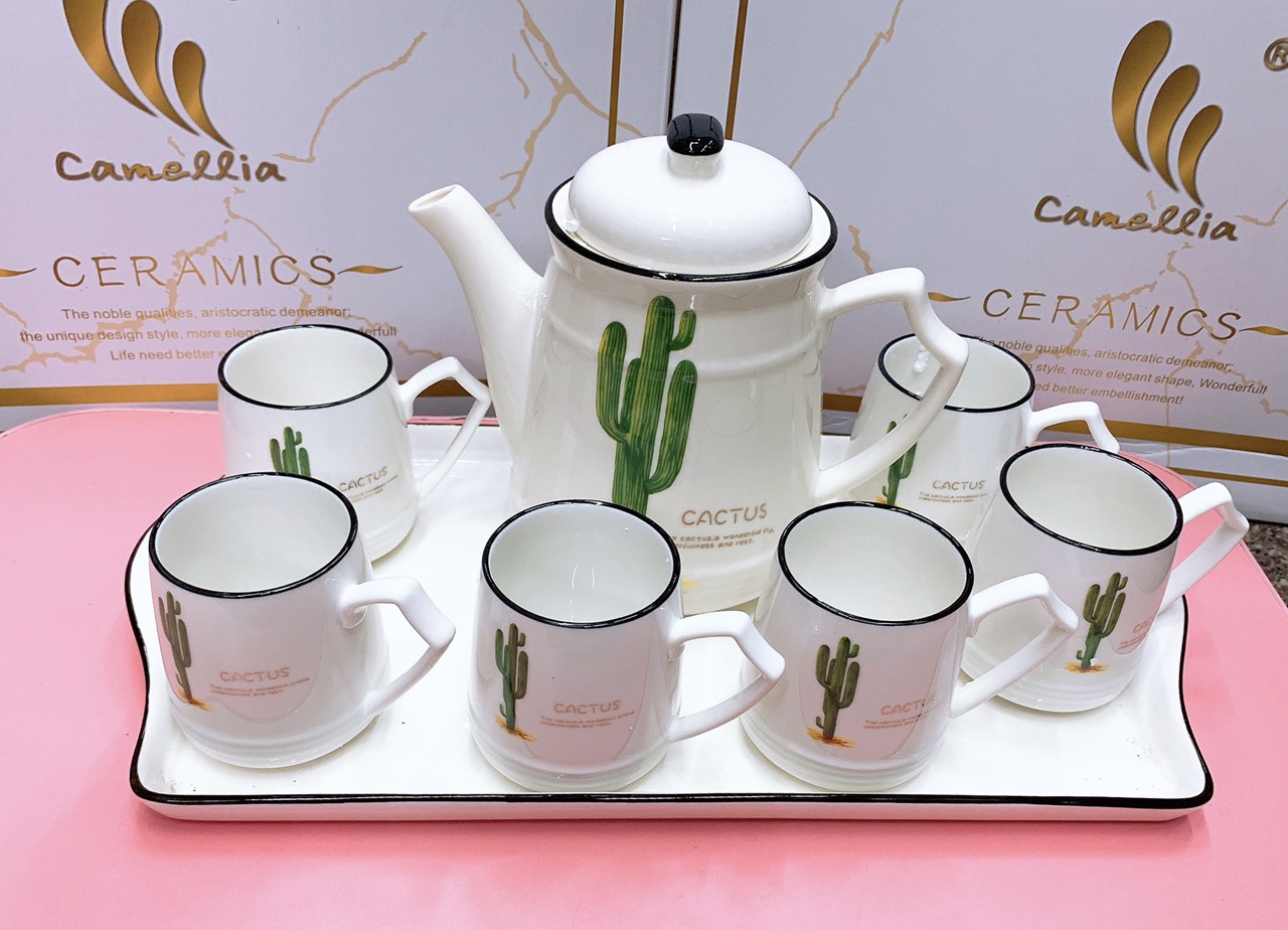 ✨Bộ ấm chén pha trà kèm khay sứ trắng họa tiết xương rồng cao - ANTH155