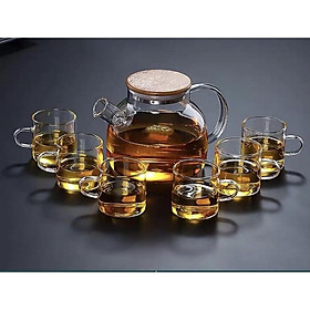 Bộ ấm ly tách pha uống trà thủy tinh chịu nhiệt, quai xách nắp gỗ, nấu được trên bếp ga và điện.