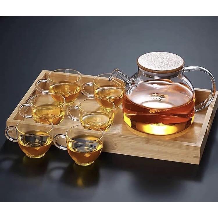 ✨Bộ ấm chén pha trà thuy tinh chịu nhiệt cao cấp nắp gỗ kèm khay tre và đế châm nến