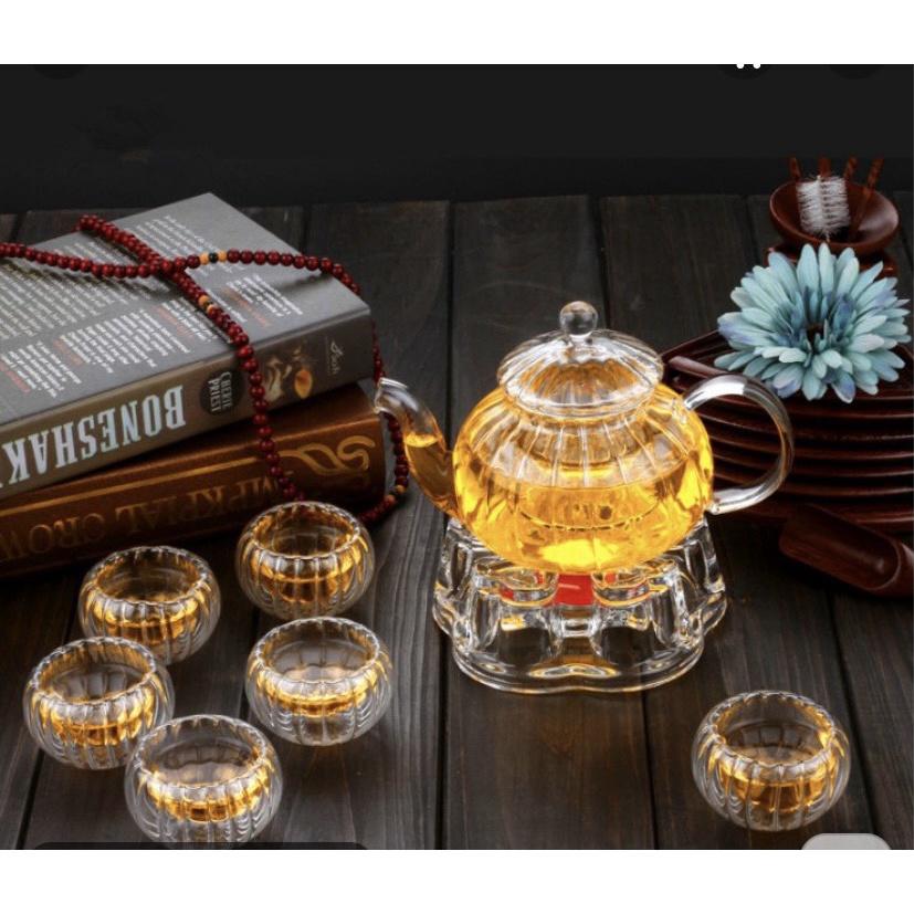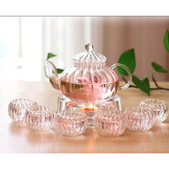 ✨Bộ ấm chén pha trà thủy tinh dáng bí 600ml kèm đế châm nến