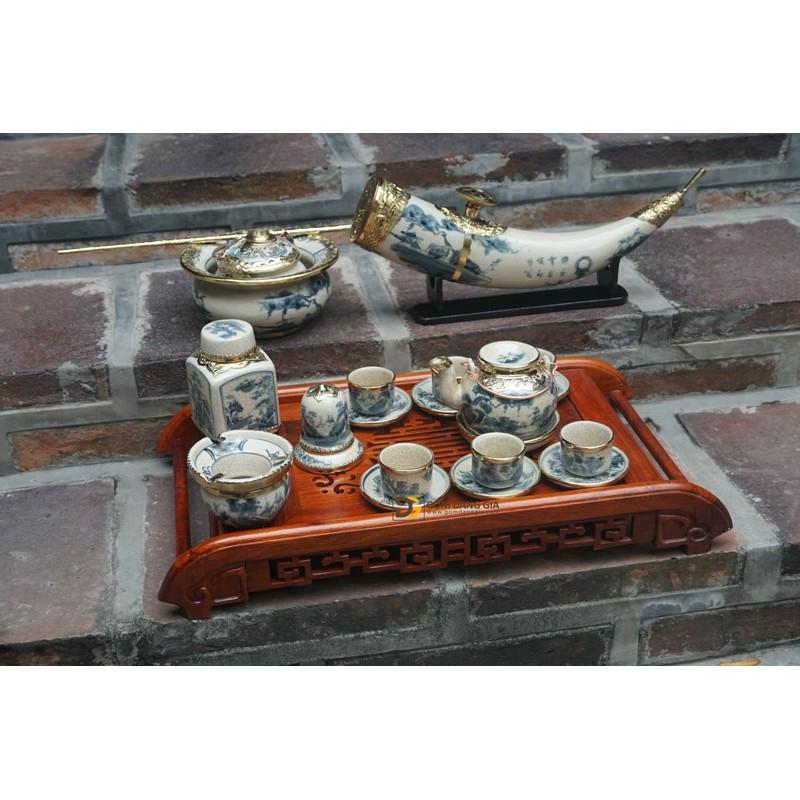 Bộ gồm: Bộ sản phẩm bao gồm: 1 ấm trà, 6 chén trà, 7 đĩa kê, 1 lọ đựng chè, 1 gạt tàn, 1 ống đựng tăm, 01 điếu bát, 01 điếu ngà
