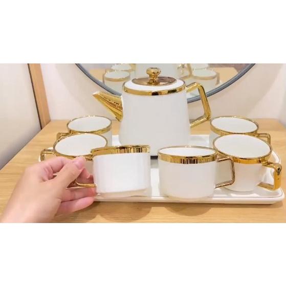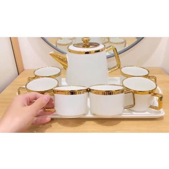 ✨BỘ ẤM TRÀ, BỘ ẤM CHÉN KÈM KHAY SỨ PHA TRÀ CÀ PHÊ TRẮNG VIỀN VÀNG VÂN TĂM