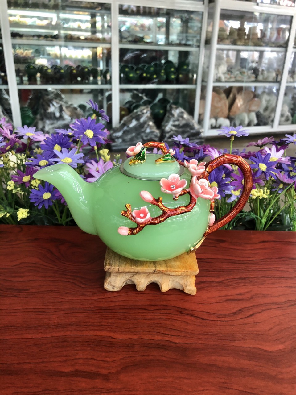 ✨Bộ ấm trà chạm hoa mai đá ngọc cẩm thạch xanh