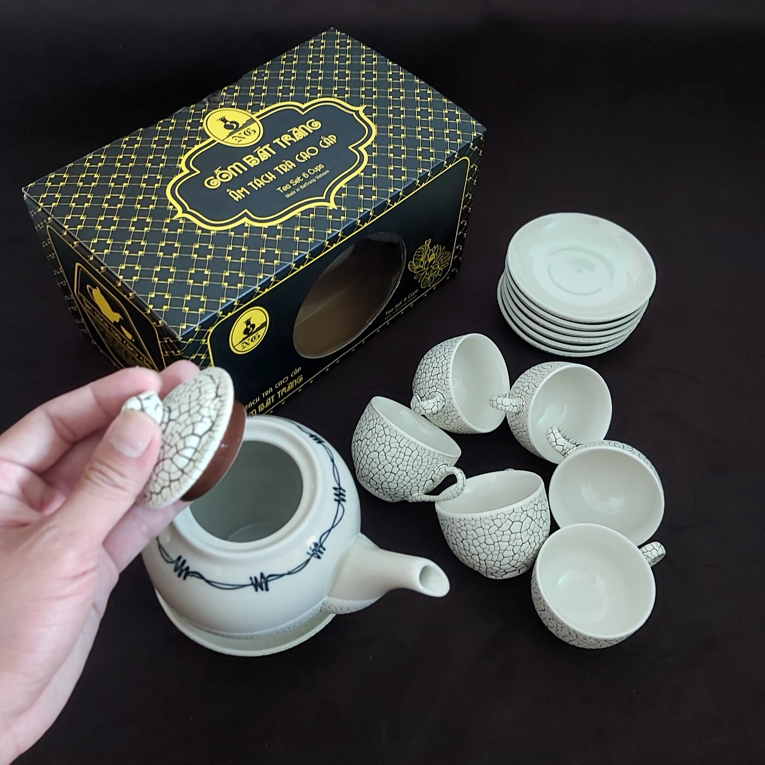 Bộ Ấm Uống trà Bát Tràng mẫu Tròn – Hoa văn nổi sần kiểu đất nẻ cực đẹp – 1 ấm, 6 ly, 7 dĩa - hộp carton - Màu Trắng Ngà Ivory