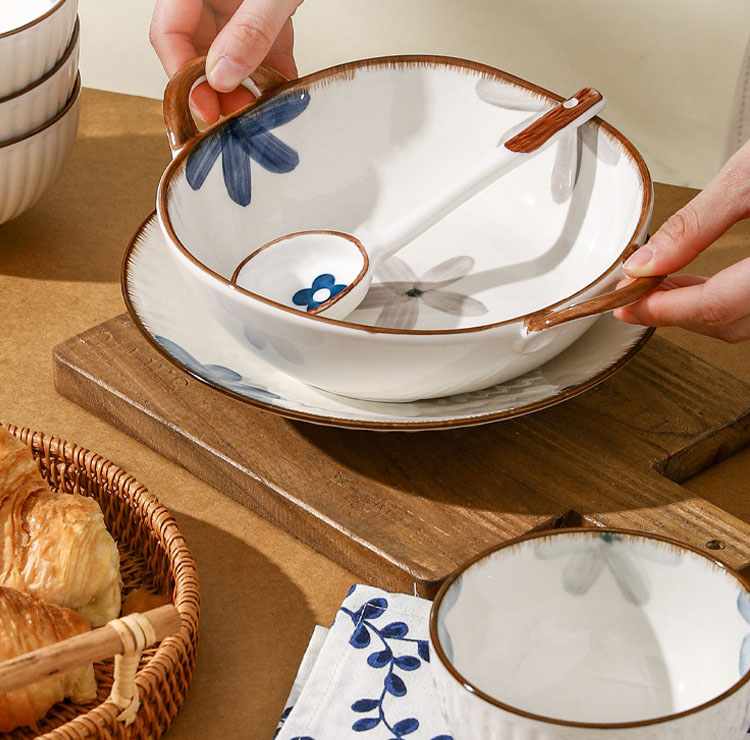 Chất liệu gốm sứ tráng men cao cấp, không chứa chì, không độc hại, thân thiện với môi trường, mẫu trắng cổ điển pha chút hoa xanh viền nâu hiện đại phù hợp với hầu hết các gia đình hiện nay, dễ dàng mua thêm mà không cần thay mới cả bộ bát đĩa đang có.