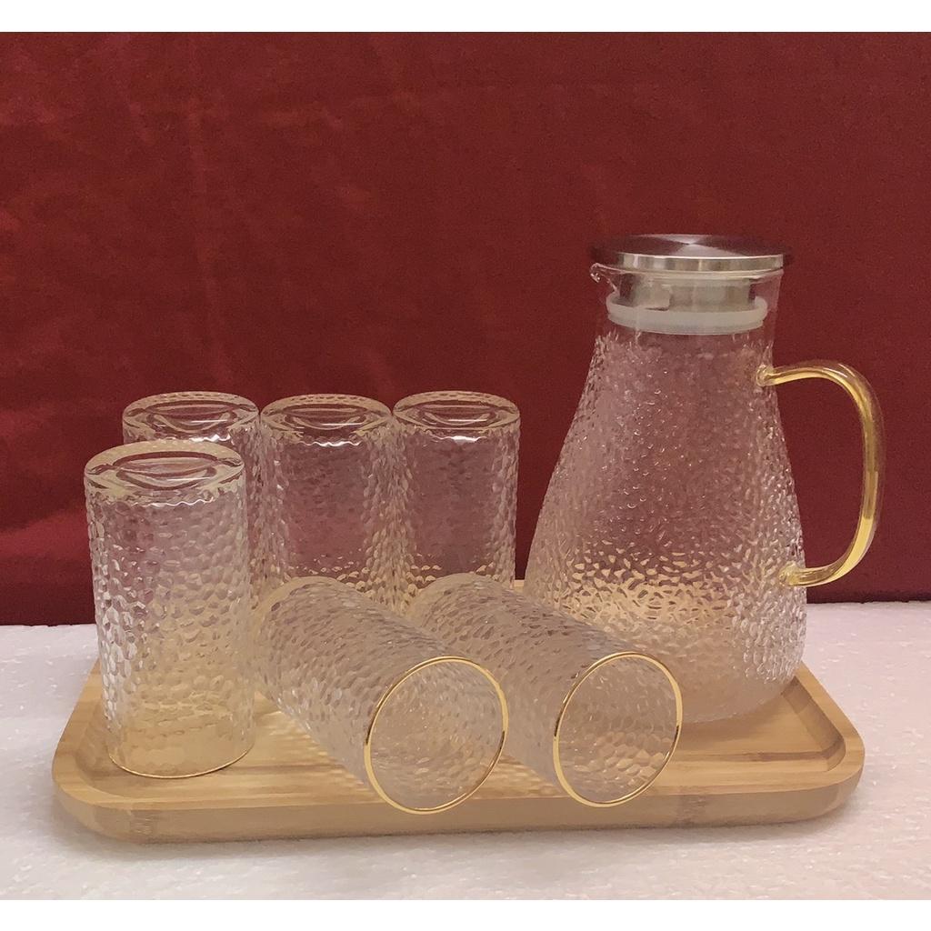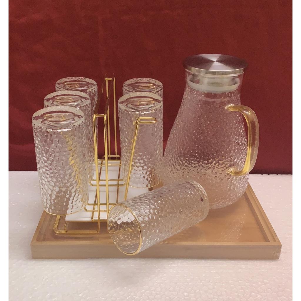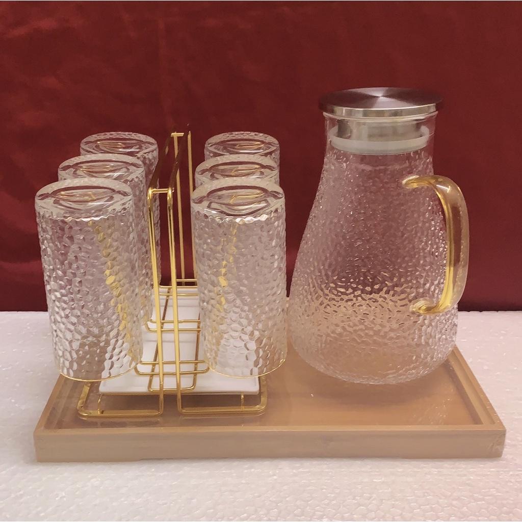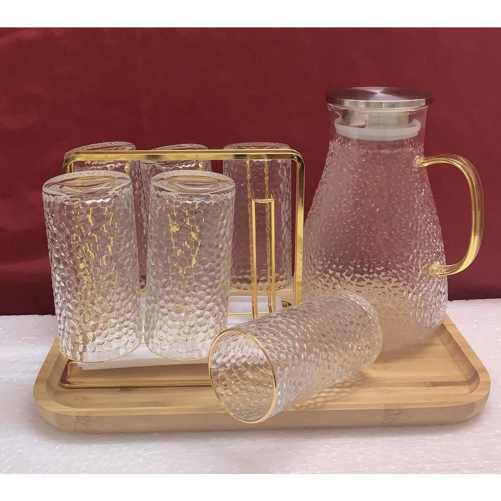 1 - Bộ combo Gồm 1 bình thủy tinh vân sần 1800ml & 6 cốc thủy tinh + 1 khay gỗ tre giao ngẫu nhiên theo ảnh trong hình đăng + 1 gía úp cốc kim loại mạ vàng