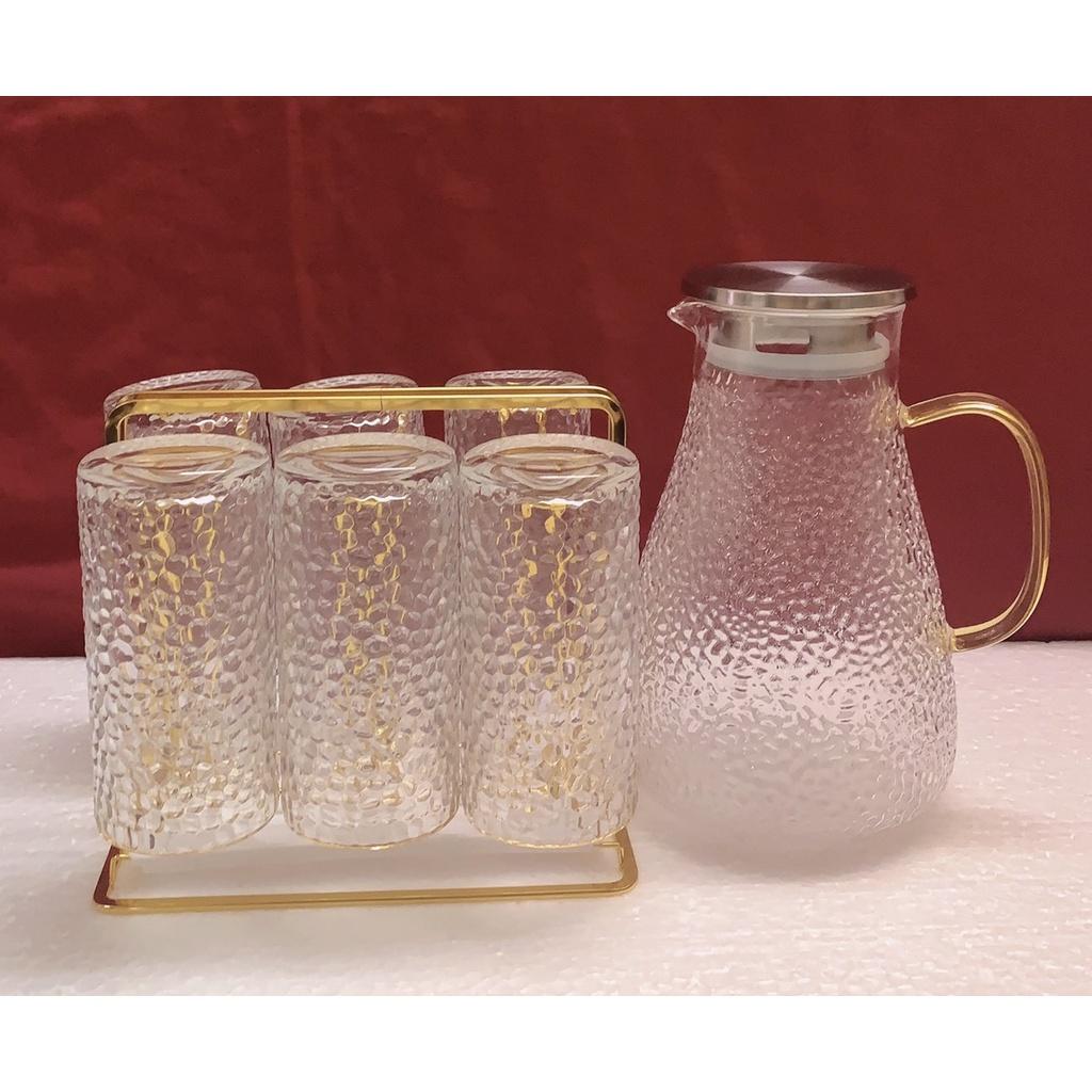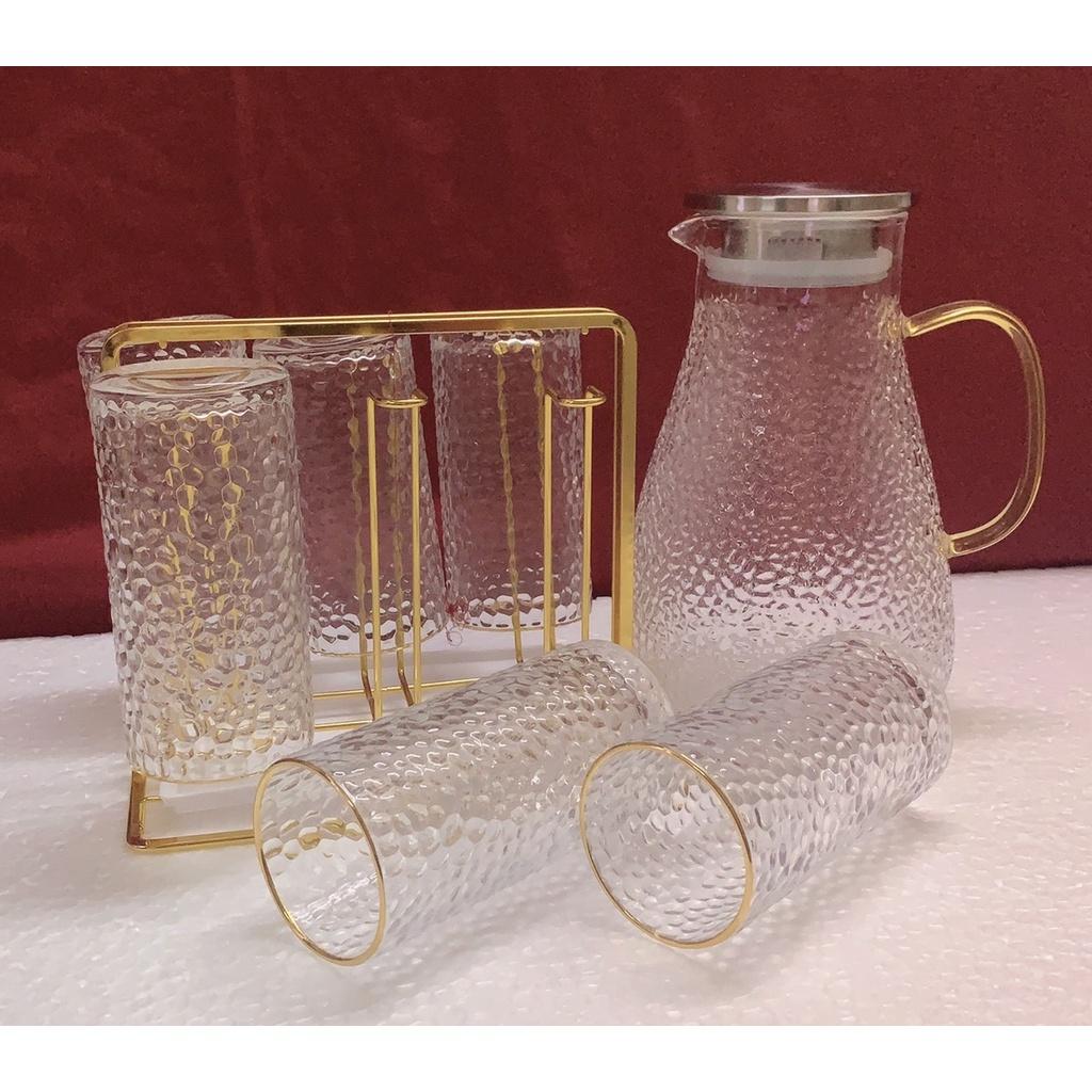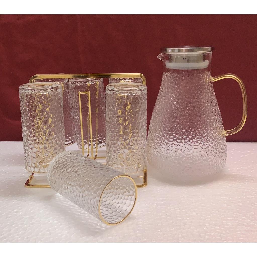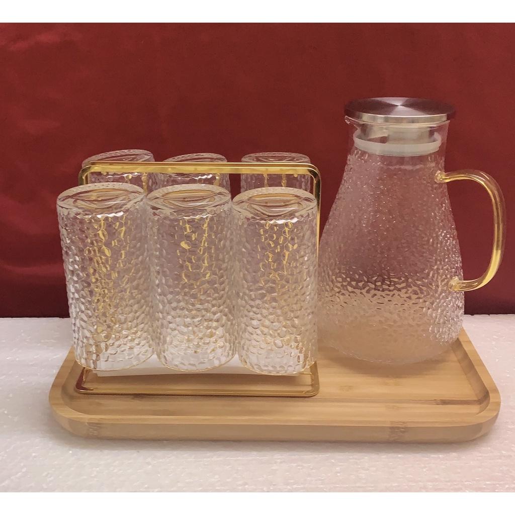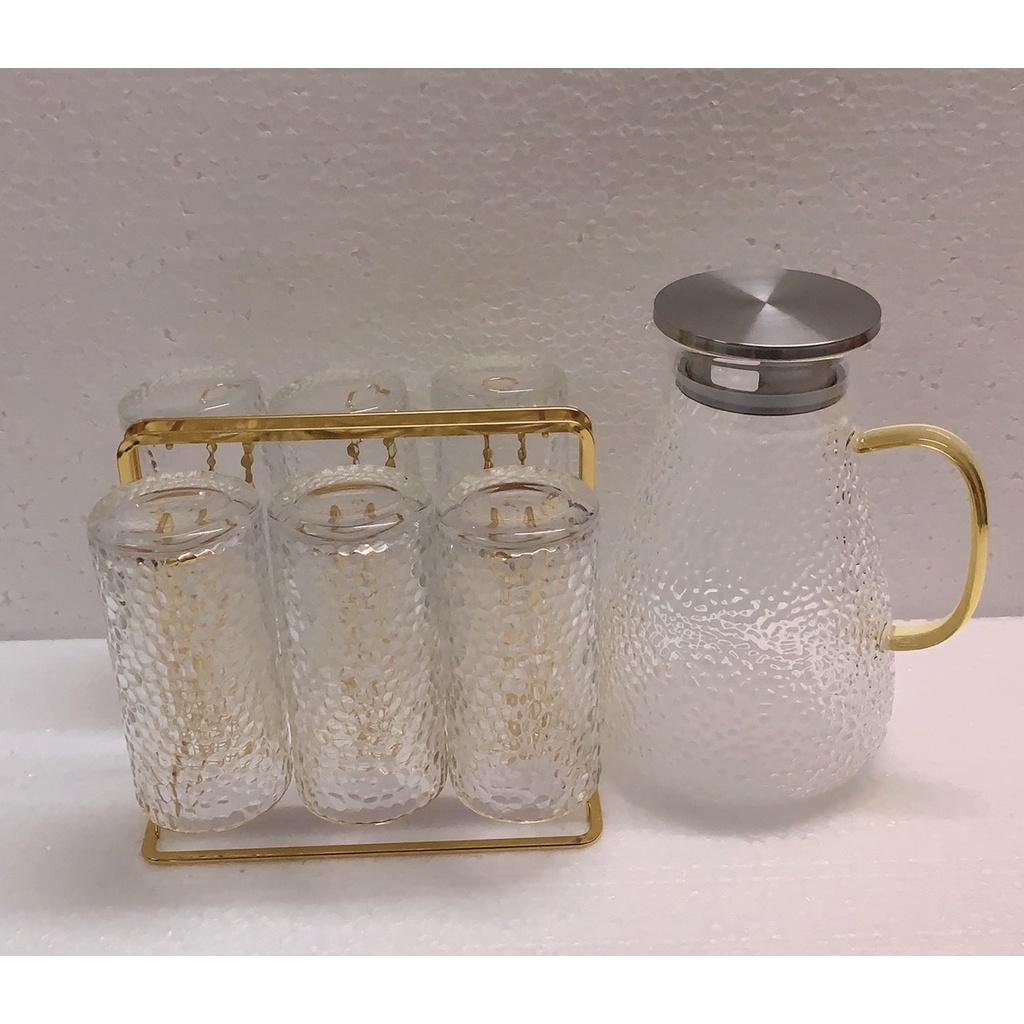 1 - Bộ combo Gồm 1 bình thủy tinh vân sần 1800ml & 6 cốc thủy tinh + 1 khay gỗ tre giao ngẫu nhiên theo ảnh trong hình đăng + 1 gía úp cốc kim loại mạ vàng