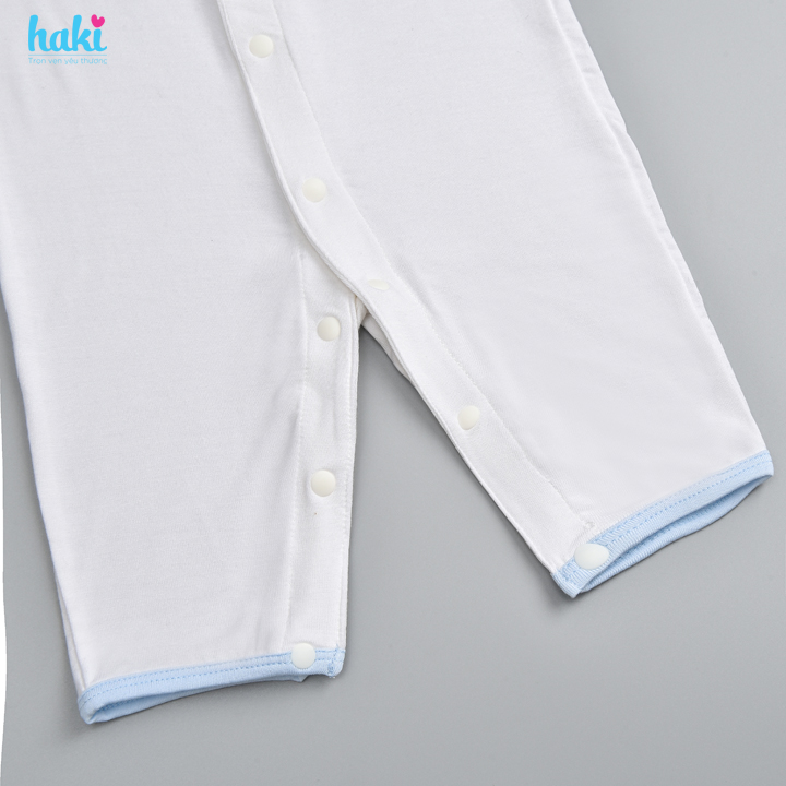 Haki sử dụng 100% cúc bấm nhập khẩu từ Nhật, mịn, lì và chắc chắn tuyệt đối. Điều này giúp ba mẹ dễ dàng thao tác khi thay trang phục cho bé, đồng thời để bé thoải mái khi lẫy, bò mà chẳng lo cứng cộm.