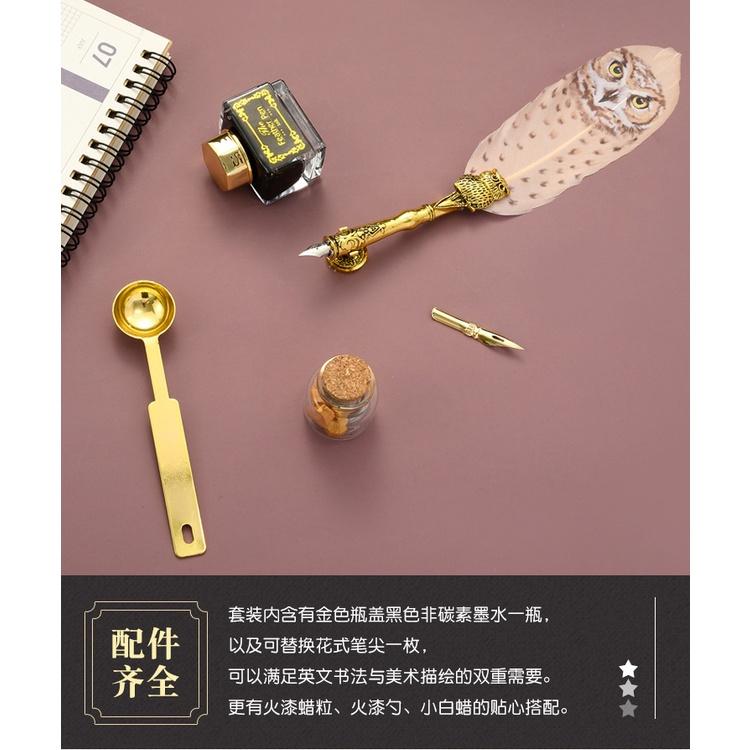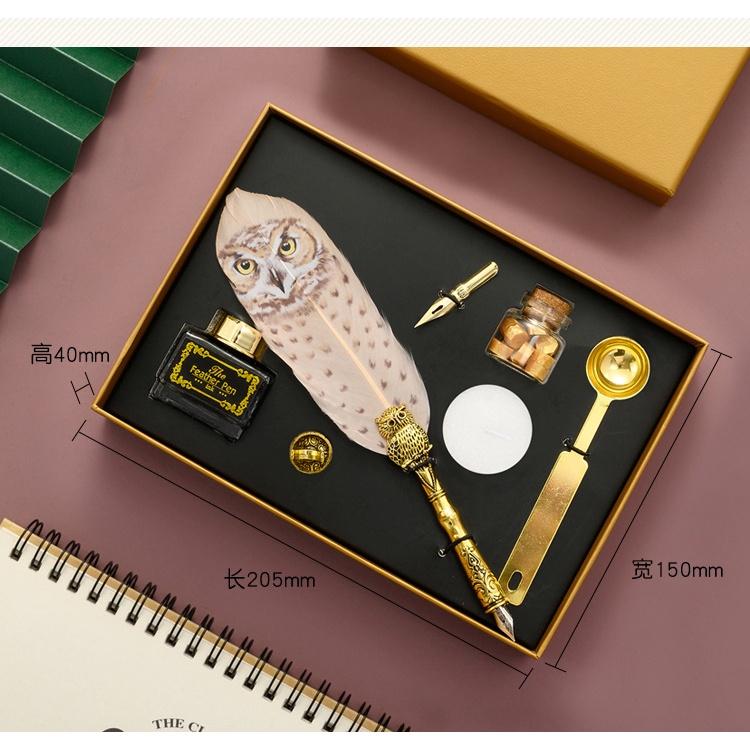 ✨Bộ bút chấm mực gắn lông vũ mặt cú Kèm phụ kiện sáp niêm phong, phong cách hoàng gia