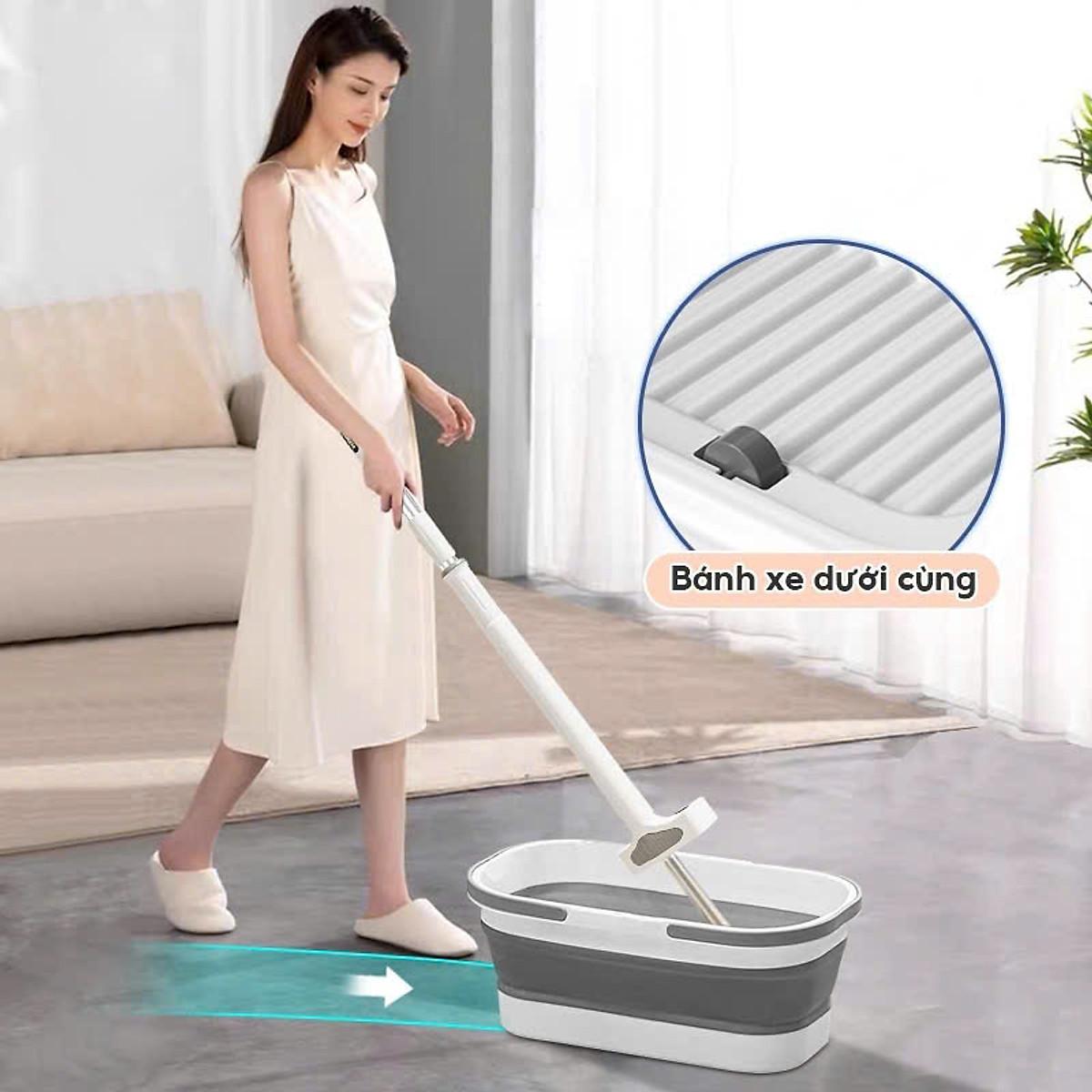 Bộ Cây Lau Tự Vắt Nhà Kèm Xô Gấp Gọn Silicon Thông Minh, Tặng Kèm 4 Bông Lau Mẫu Mới 2025
