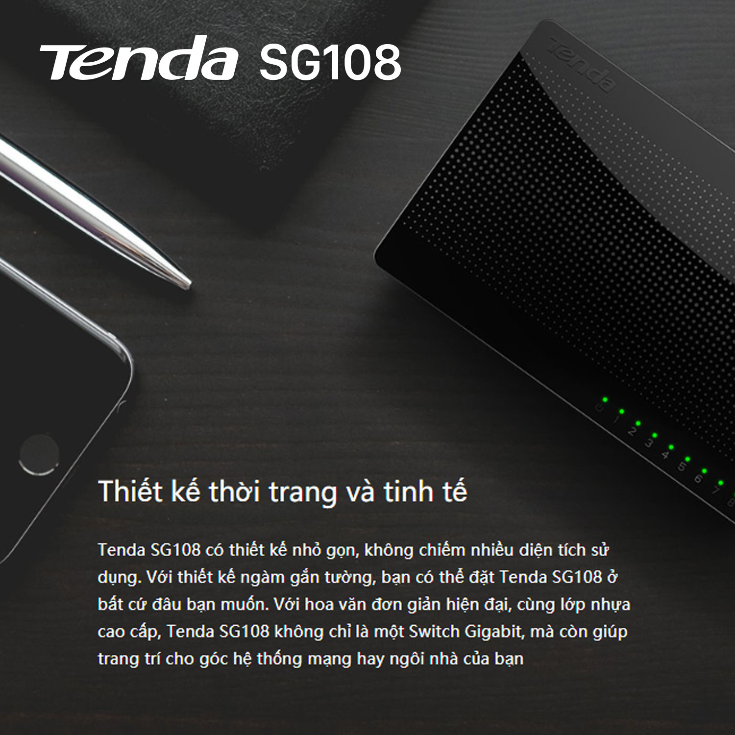 Switch 8 Port 10/100M Tenda SG108 Switch Tenda SG108 là bộ chia mạng SOHO 8 cổng Gigabit tới từ Tenda, được thiết kế để đặc biệt phù hợp với những văn phòng nhỏ hay văn