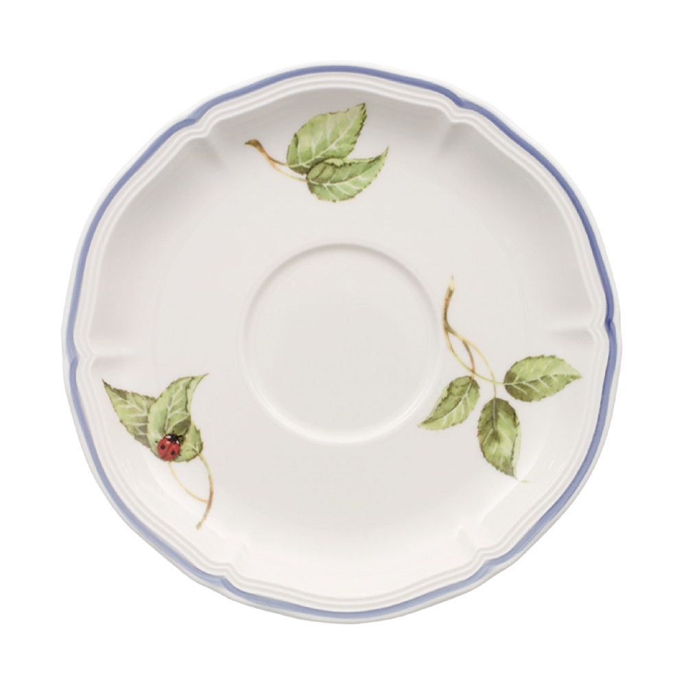 Bộ Cốc Kèm Đĩa Villeroy & Boch Cottage 1011151230 với họa tiết trái cây tim tím trên nền trắng của chất liệu Sứ cao cấp, cộng thêm họa tiết viền xanh giúp bộ cốc kèm đĩa này nổi bật trên chiếc bàn tiệc.