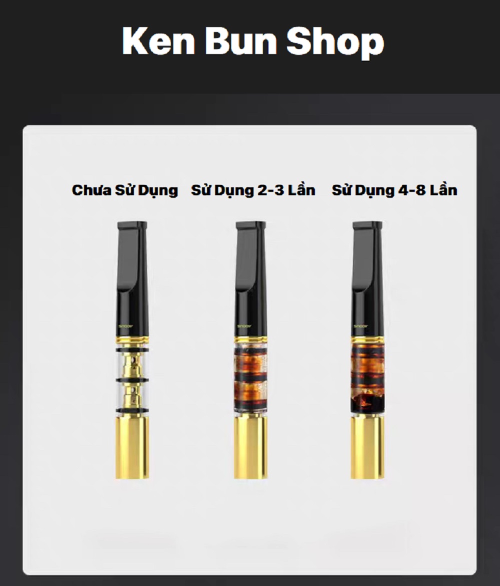 - Sau một thời gian sử dụng, Lỗ nhỏ thông khói bên trong lõi sẽ tích tụ 1 lượng nhựa vàng sẫm, khi đó hãy tháo lõi ra vệ sinh bằng bộ kim chuyên dụng có tặng kèm trong hộp ( Để lõi sạch như mới thì có thể ngâm lõi trong nước ấm khoản 10-15 phút, Sau đó lau khô - sạch gắn lại vào để sử dụng tiếp )