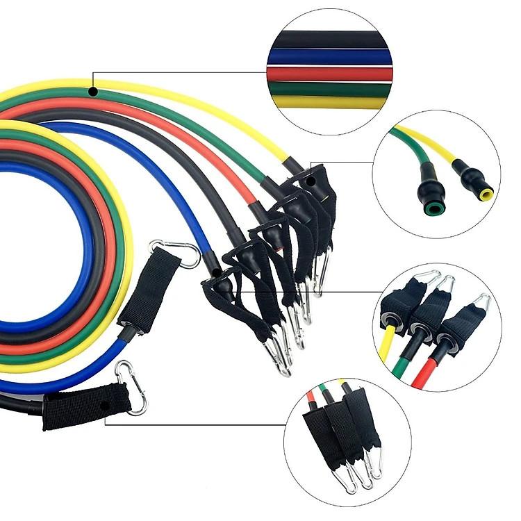 Bộ dây đàn hồi tập thể lực có 5 dây, mỗi dây có mức trọng lượng khác nhau, từ nhẹ tới nặng (8 lbs, 15 lbs, 20 lbs, 25 lbs, 30 lbs) có thể