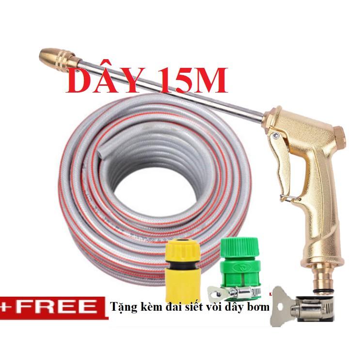 ✨Bộ dây vòi xịt nước rửa xe, tưới cây . tăng áp 3 lần, loại 15m 206701-3 đầu đồng, cút+ tặng đai
