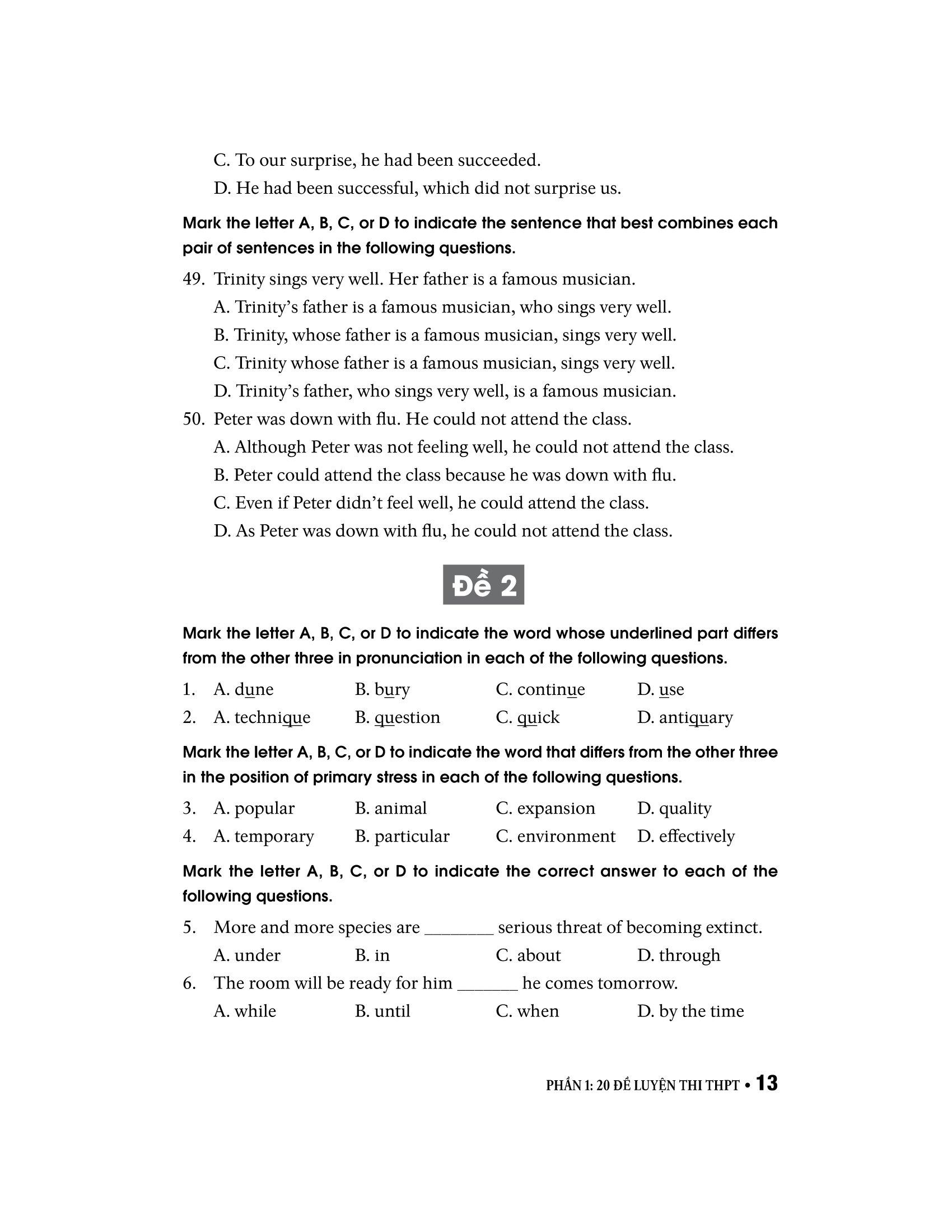Mỗi đề luyện thi gồm 50 câu trắc nghiệm kiến thức ngữ âm (phonetics), từ vựng (vocabulary), ngữ pháp (grammar), đọc (reading) và viết (writing):