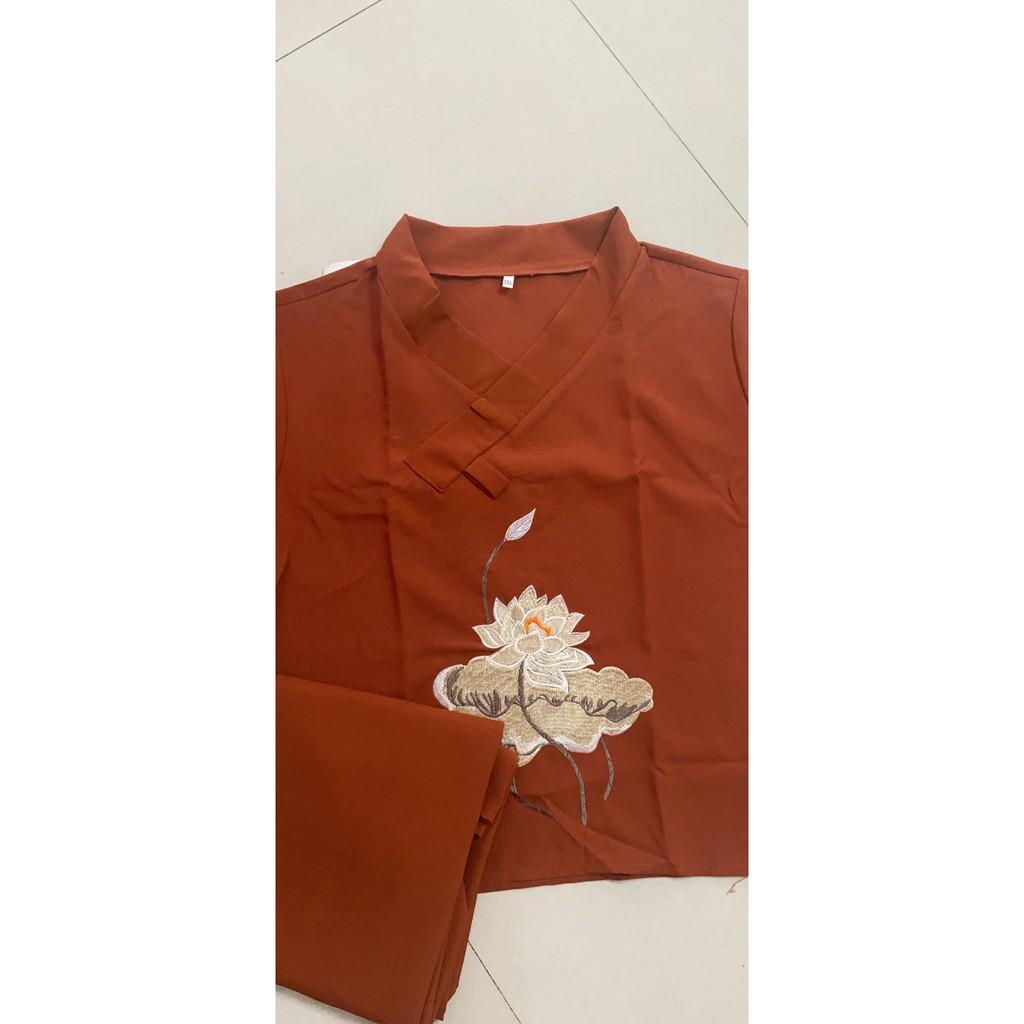 - Áo thiết kế cổ tim bè lai kết hợp hoa sen được thêu chi tiết tỷ mỹ