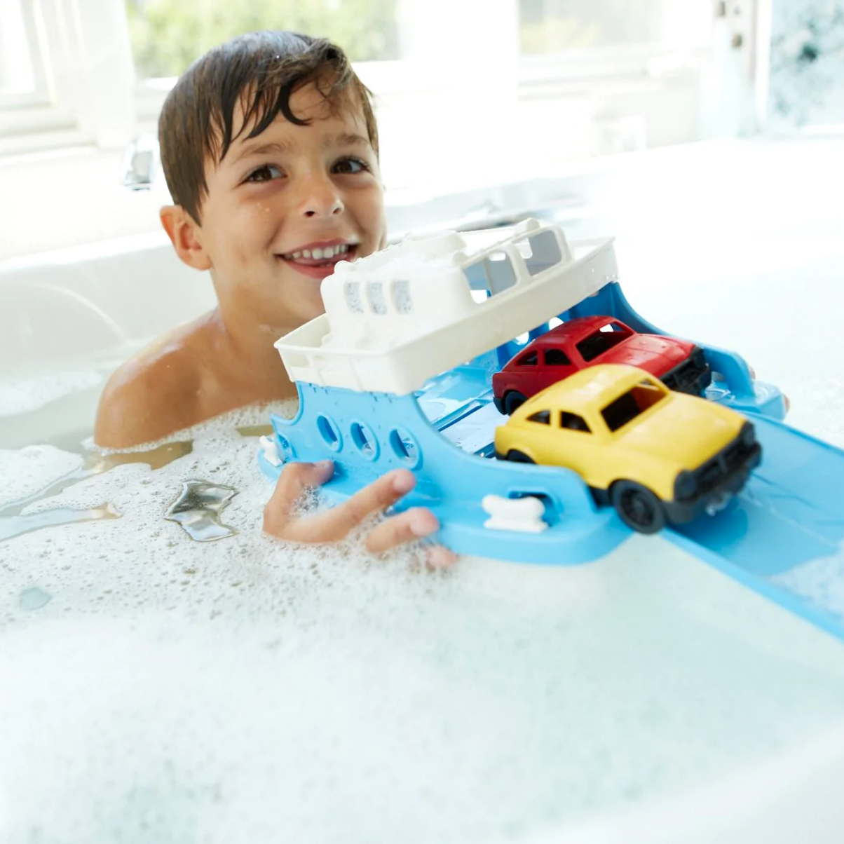 Ra khơi với chiếc phà Green Toys cho một hành trình quanh bồn tắm hoặc một chuyến đi vượt hồ bơi. Bất kể cuộc phiêu lưu nào, chiếc phà hai tầng này sẵn sàng cưỡi sóng chở rất nhiều hàng hóa và cả hai chiếc xe hơi. Dùng cầu trượt để chất hàng vào khoang, đủ rộng để chứa được bốn xe hơi Green Toys. Boong trên cùng có hai hàng ghế dài hai bên và 11 cửa sổ nhìn xuống phía dưới. Được sản xuất tại USA từ 100% bình đựng sữa nhựa tái chế, tiết kiệm năng lượng và giảm khí thải gây hiệu ứng nhà kính, chiếc phà này lý tưởng chơi dưới nước. Bền, nổi trên mặt nước, thân tàu có thể tháo rời để dễ dàng vệ sinh.