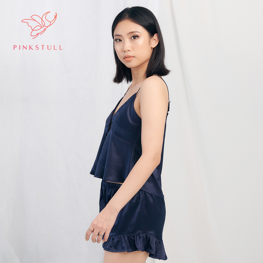 ✨Bộ đồ ngủ hai dây ngắn Pink Stull nút bọc xanh đậm