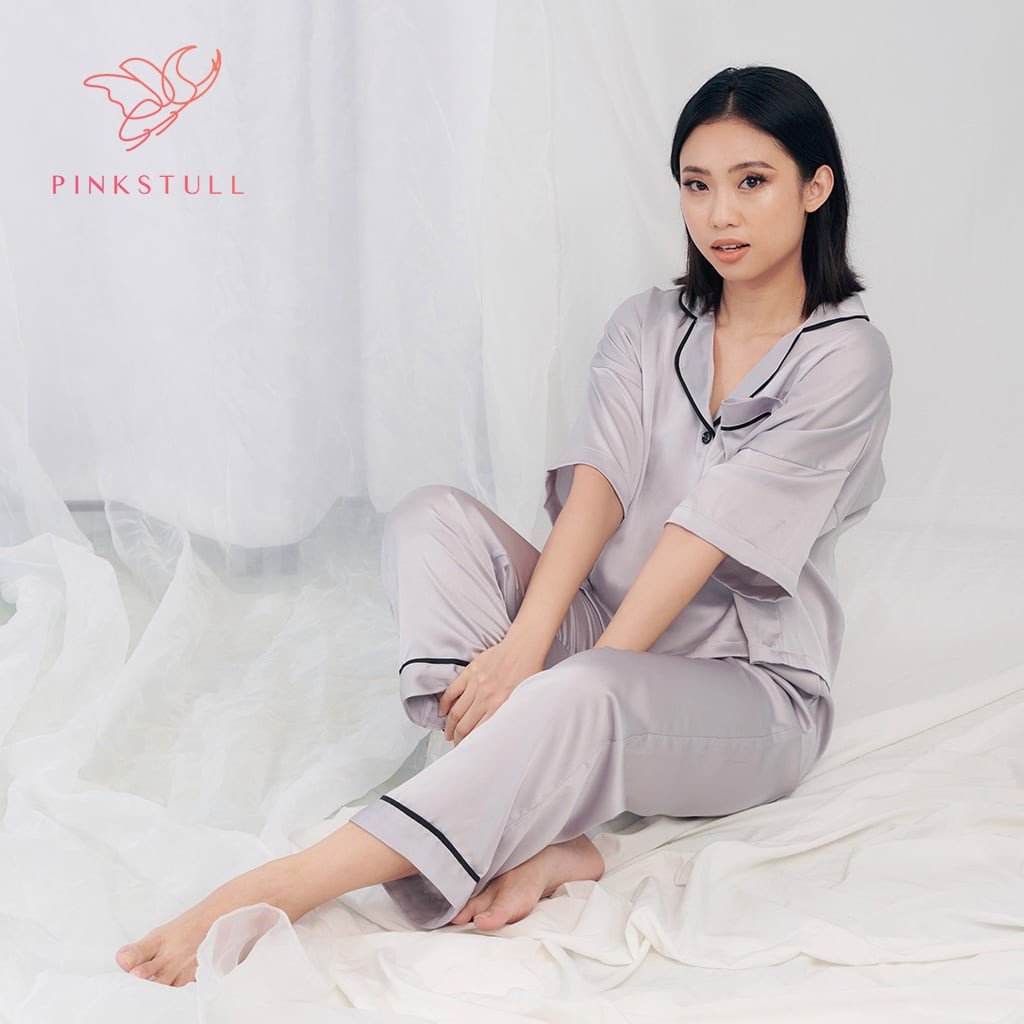 ✨Bộ đồ ngủ pijamas tay ngắn quần dài Pink Stull 3 Màu:xám viền đen,đỏ viền trắng,hồng viền đen