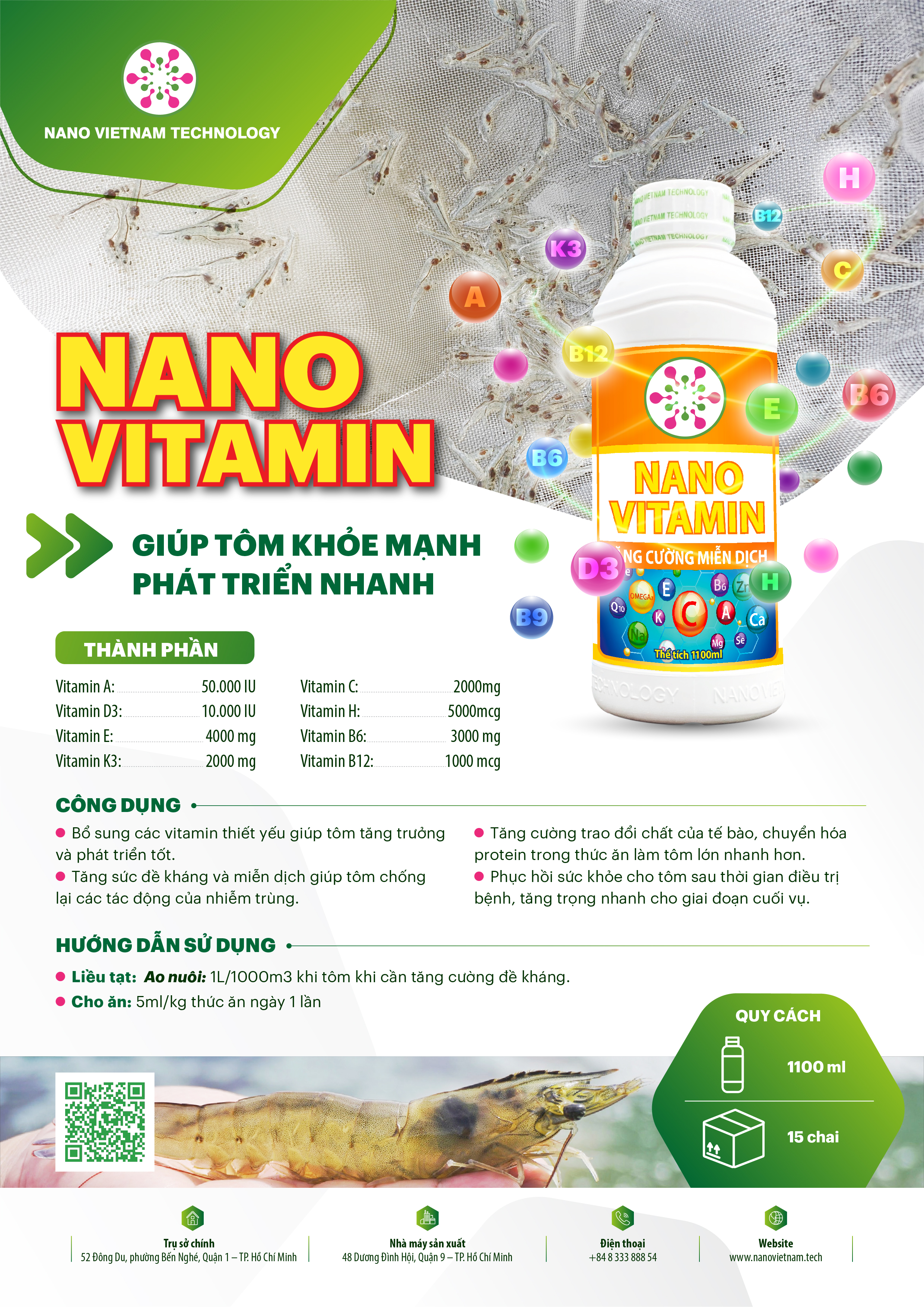 THÔNG TIN SẢN PHẨM: Nano Vitamin được sản xuất theo quy trình công nghệ Gamma tiên tiến cung cấp Vitamin cho tôm, cá phát triển cân bằng. Tăng cuường hệ miễn dịch, chống chịu thời