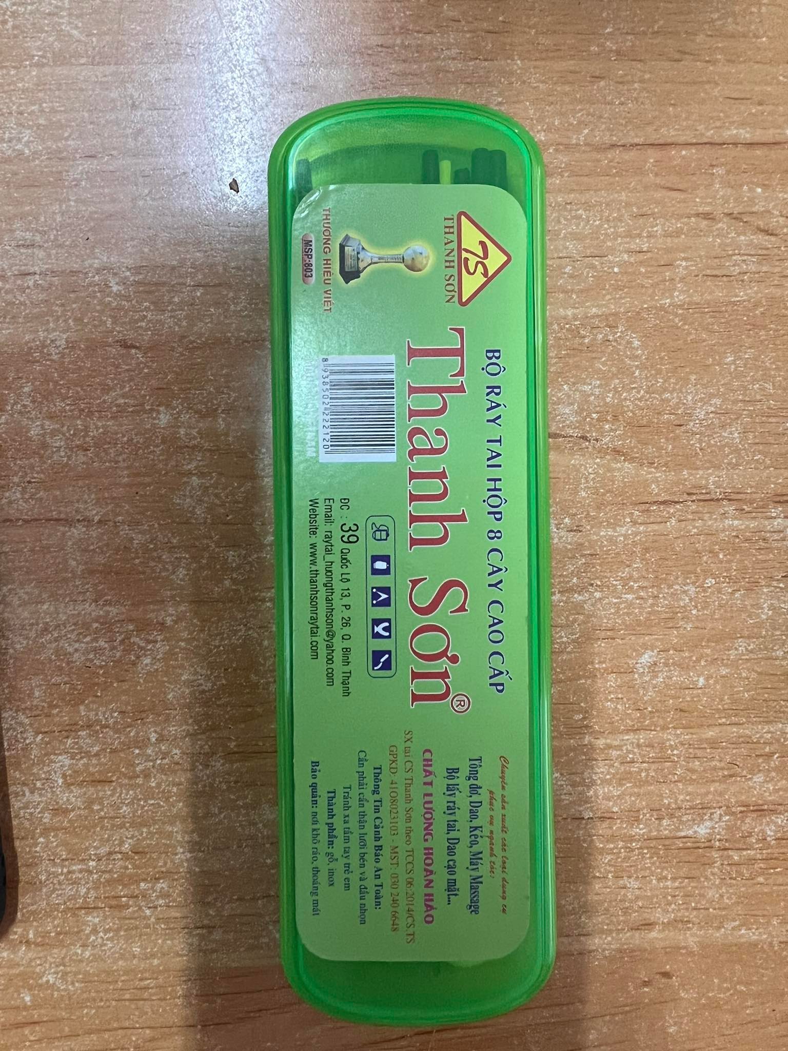- Trọng lượng: 132gr Bộ ráy tai Thanh Sơn 8 món inox, cán nhựa 1 cây móc tai 2 cây mại tai 1 cây đánh mắt 1 cây gấp ráy 1 cây cạo lông tai 1 cây móc gió 1 cây càn cua