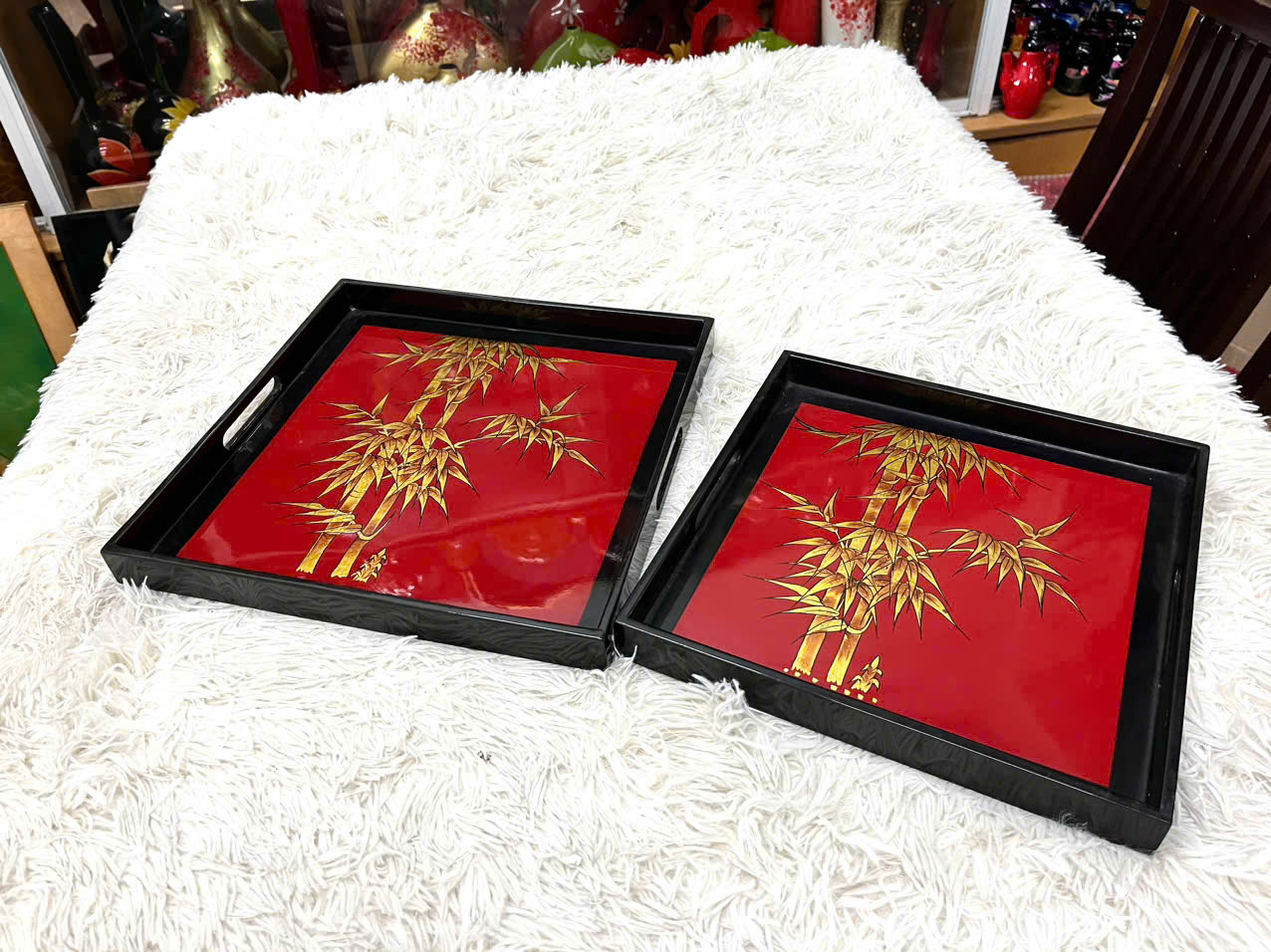Chất liệu sơn mài nên khay rất bền, bóng đẹp theo năm tháng, thân thiện môi trường. Sơn mài là một kỹ thuật chất liệu kỳ diệu và độc đáo mà khi nói đến nghệ