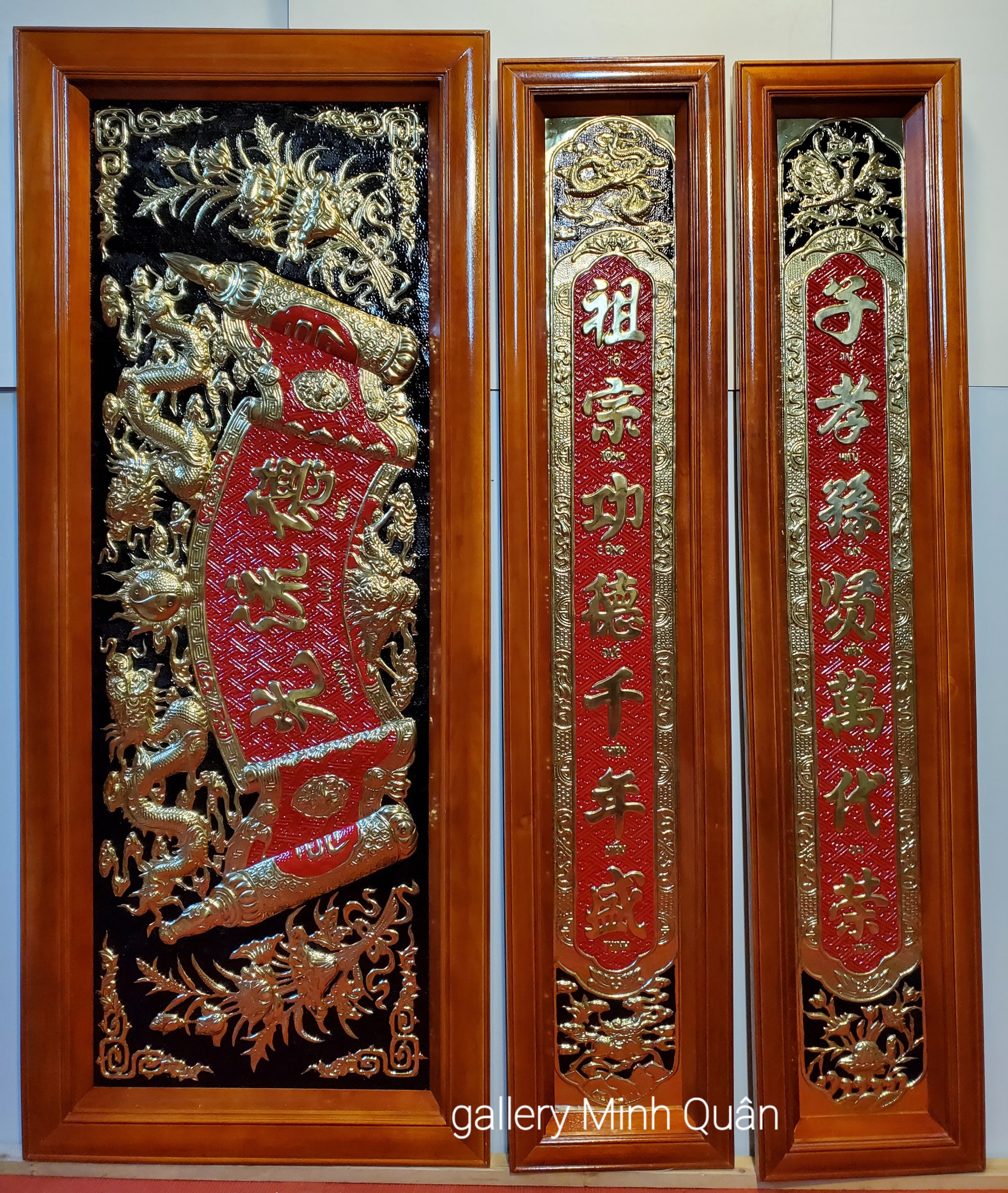 ✨BỘ HOÀNH PHI CÂU ĐỐI THỜ GIA TIÊN ( ĐỒNG VÀNG LIỀN TẤM KHUNG GỖ DỔI SƠN PU)