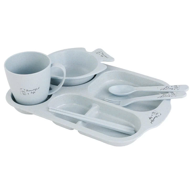 Bộ sản phẩm gồm 6 món: khay, bát, cốc, thìa, dĩa, đũa - đầy đủ những vật dụng cần thiết để bé tập ăn