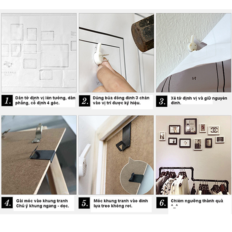 Bước 4: Móc hết khung ảnh lên đinh đã đóng, chú ý móc đinh và móc khung phải khớp với nhau.
