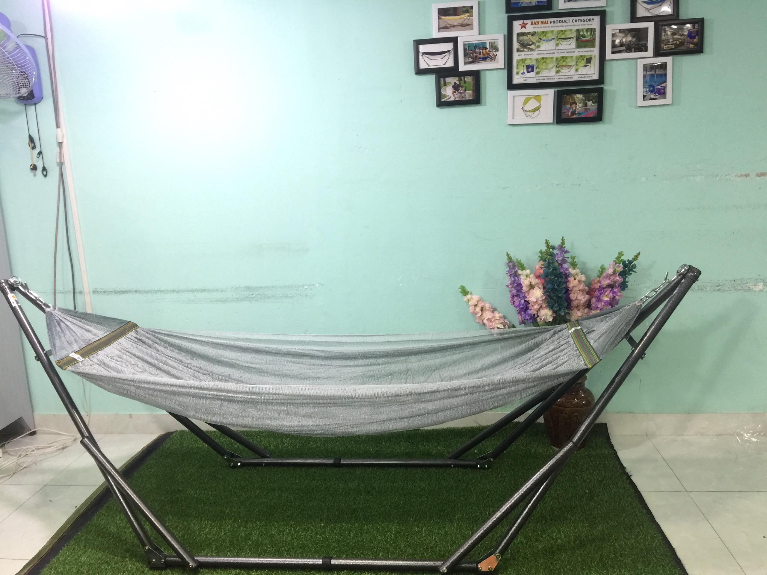 Ống thép, sơn tĩnh điện. đường kính 27.0mm, chiều dày 0.9mm. 4 thanh chống uốn cong, thẩm mỹ, thông thoáng, an toàn. Võng lưới sợi 100% polyester, mềm mịn, có độ co giãn, lưới Xuất