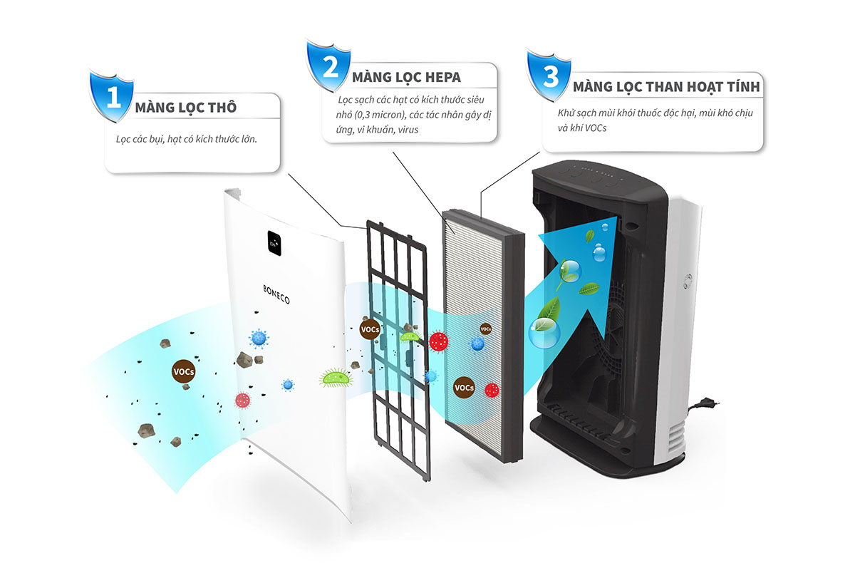 Máy lọc không khí BONECO sẽ giúp bạn loại bỏ ít nhất 99% các loại hạt (kích thước 0,3 micron). Tuy nhiên, nếu chỉ sử dụng màng lọc HEPA sẽ không thể giúp loại bỏ mùi hôi, chất độc hại, các phân tử khí trong không khí (kích thước nhỏ hơn < 0,1 micron) trừ khi kết hợp màng lọc HEPA với công nghệ hỗ trợ. Những hạt có mức độ phân tử vẫn có thể xuyên qua. Đó cũng là lý do Máy lọc không khí BONECO ngoài màng lọc HEPA còn sử dụng màng lọc Than hoạt tính hữu cơ (từ sợi sơ dừa hữu cơ).
