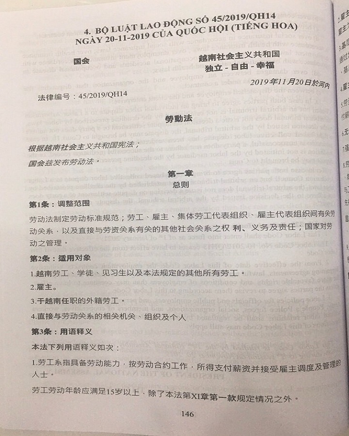 BỘ LUẬT LAO ĐỘNG SỐ 45/2019/QH14 NGÀY 20-11-2019 CỦA QUỐC HỘI (TIẾNG HOA).