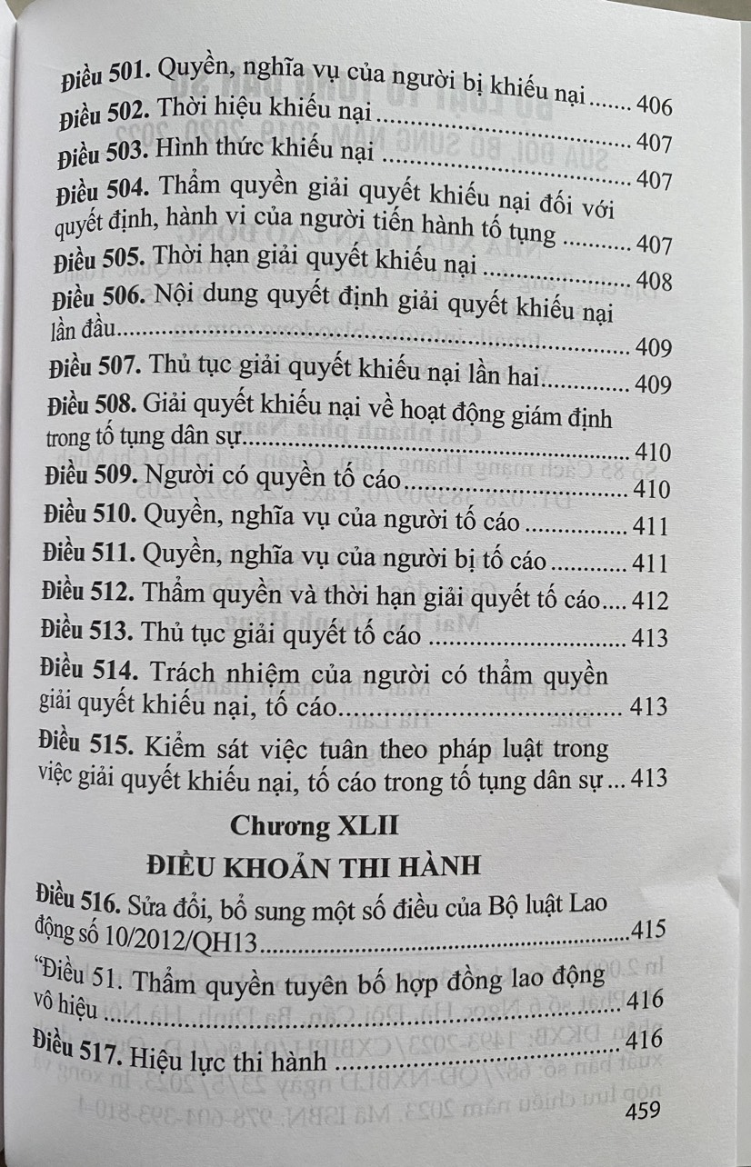 năm 2019 và Luật Doanh nghiệp năm 2020; gồm 10 phần, 42 chương, 517 điều, quy định những nguyên tắc cơ bản trong tố tụng dân sự; trình tự và thủ tục để khởi kiện, yêu cầu để Tòa án giải quyết tranh chấp dân sự, hôn nhân và gia đình, kinh doanh, thương mại, lao động…