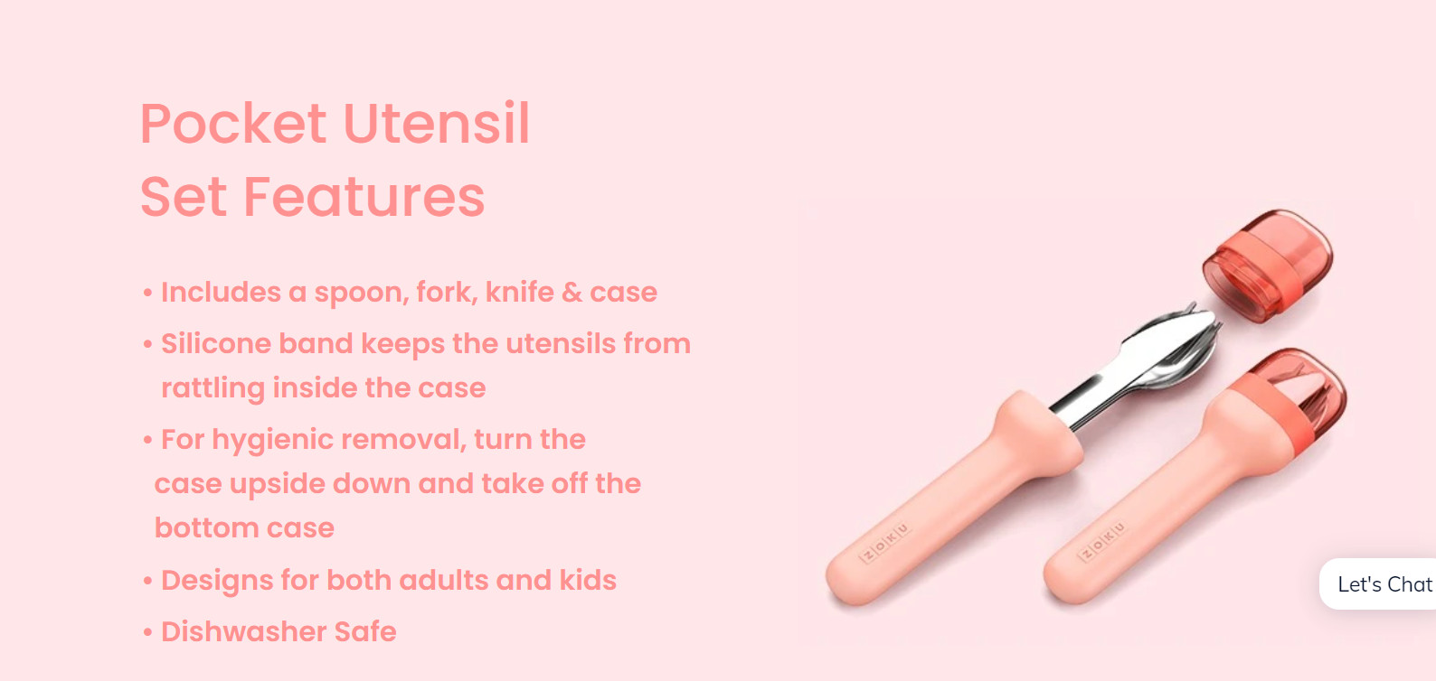 Plastic box comes in three colors: emerald green, peach and charcoal, and the set of utensils is made of stainless steel.