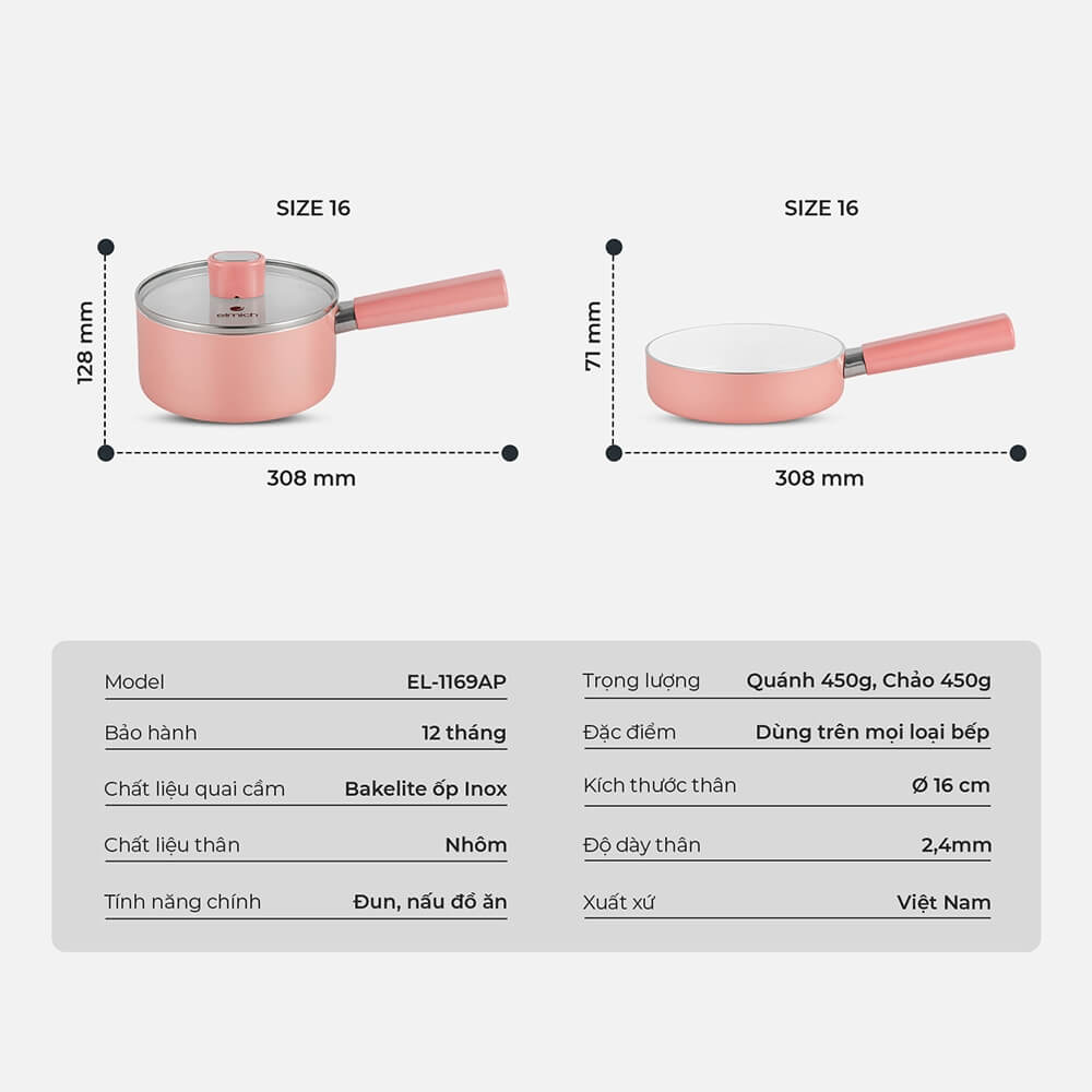 Bộ nồi chảo chống dính 16cm Elmich baby EL-1169AP, Hàng chính hãng, Dùng được nhiều loại bếp - JoyMall
