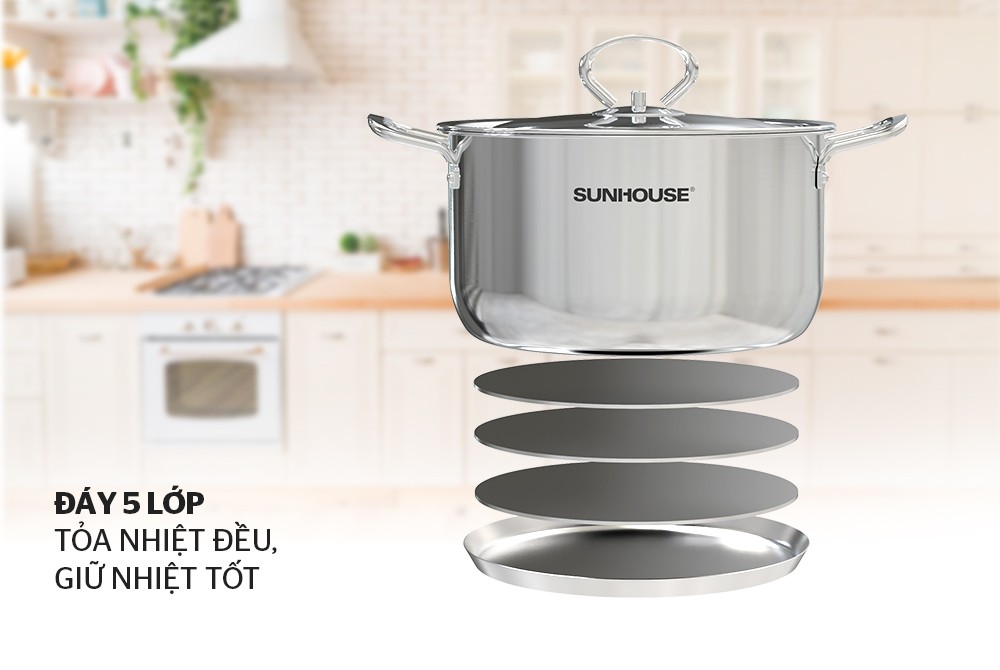 Bộ nồi inox 5 đáy đa năng Sunhouse SHG788 chính hãng không kén bếp