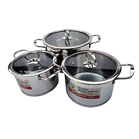 Bộ sản phẩm bao gồm: 01 x Nồi nhỏ có nắp kích thước 20x11.5 cm 01 x Nồi lớn có nắp kích thước 24x13.5 cm 01 x Chảo kích thước 24x4,5 cm Nồi bếp từ