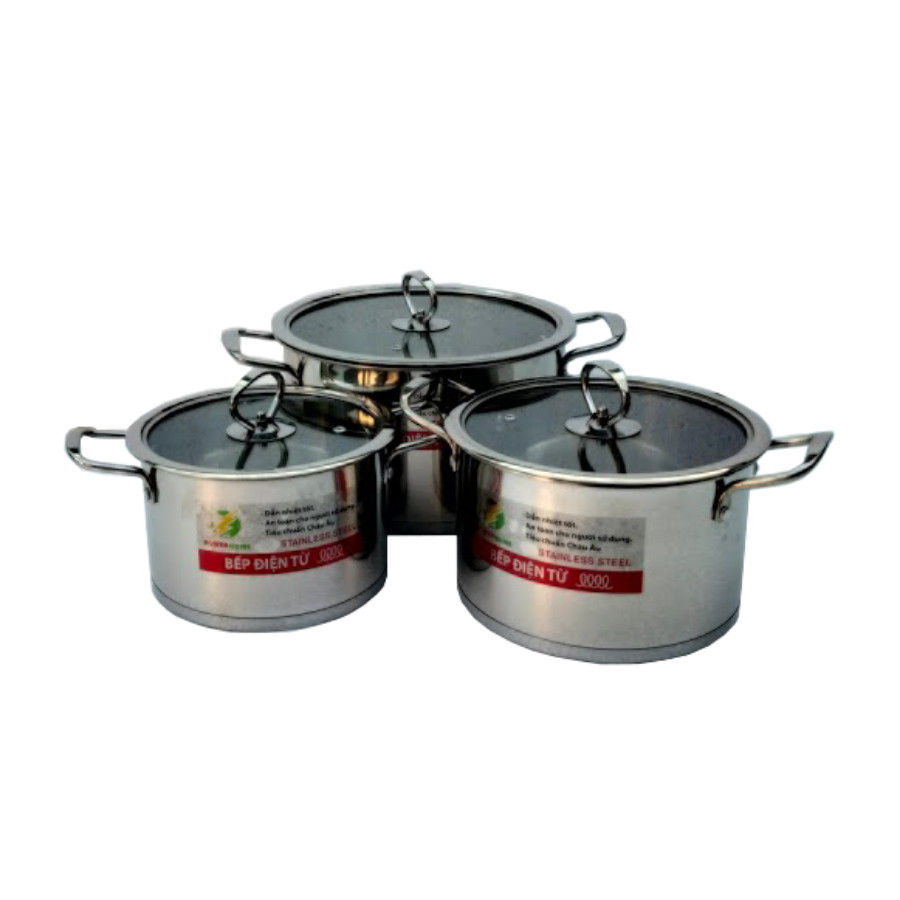 Bộ 3 Nồi Inox Power Home cấu tạo đáy 3 lớp là 1 sản phẩm của thương hiệu Power Home, sản xuất tại Việt Nam dựa trên dây chuyền và công nghệ hiện đại của Hàn Quốc. Bộ nồi gồm 3 chiếc với kích thước khác nhau, được làm từ chất liệu inox cao cấp, cấu tạo đáy 3 lớp , có thể sử dụng được trên bếp từ, bếp hồng ngoạ