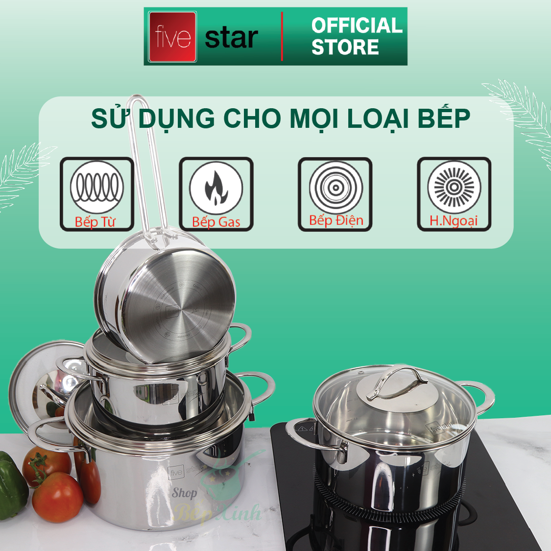 Bộ nồi gồm : 1 quánh 16cm , 1 nồi 18cm , 1 nồi 20cm , 1 nồi 24cm và 1 chảo tổ ong 24cm