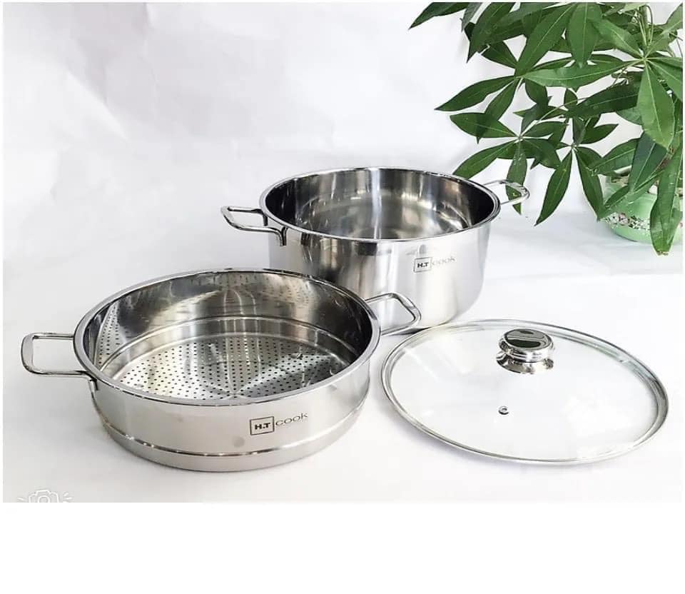 Bộ nồi xửng hấp HT Cook 28 cm và 30cm với chất liệu inox cao cấp, dày, bền, chắc, sử dụng được cho cả bếp điện từ. Sản phẩm có nắp kích cường lực giúp quan sát được thực phẩm bên trong.