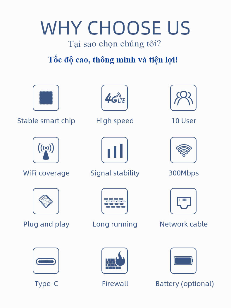G LTE hỗ trợ tốc độ Download lên đến 150Mbps, tốc độ Upload là 50Mbps Tốc độ mạng Wi-Fi lên đến 150Mbps. Đèn LED hiển thị trạng thái kết nối. Hỗ trợ lên đến 10