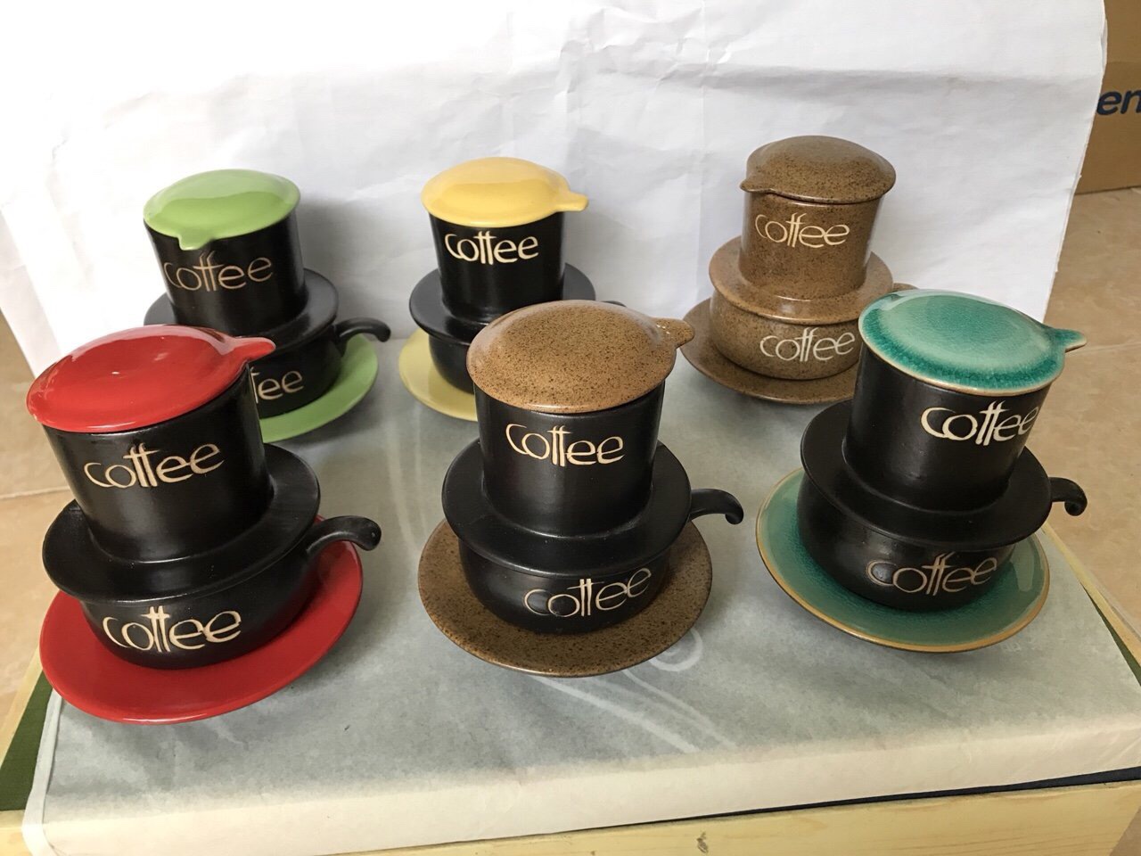 Có 4 màu: đỏ - vàng - xanh - nâu Bộ phin pha cafe gốm sứ Bát Tràng là dòng quà tặng nổi bật, được nhiều khách hàng quan tâm, bởi những ưu điểm tuyệt