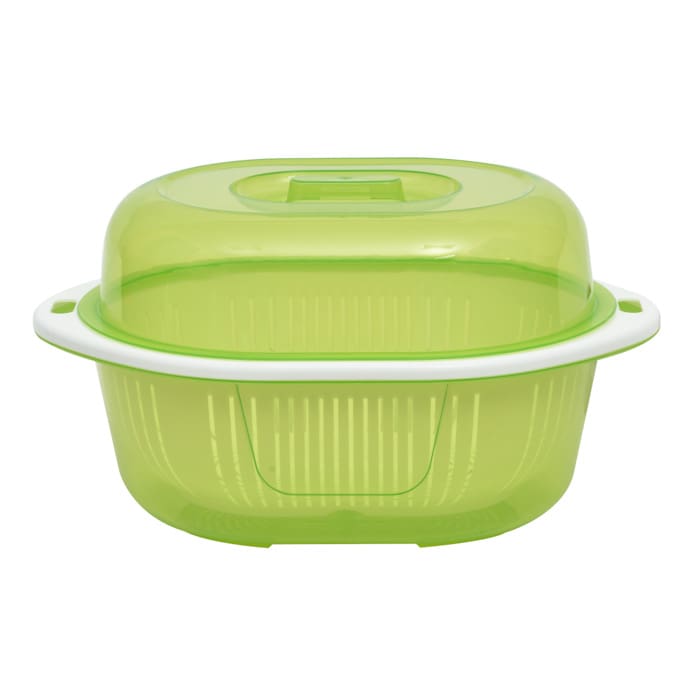 Bên ngoài là một lớp chậu tách biệt có tác dụng giữ nước, tránh để nước tràn ra trong quá trình để ráo hoa quả, rau củ. Nắp có độ trong suốt cao cùng tay cầm tiện lợi cho người dùng khi sử dụng.