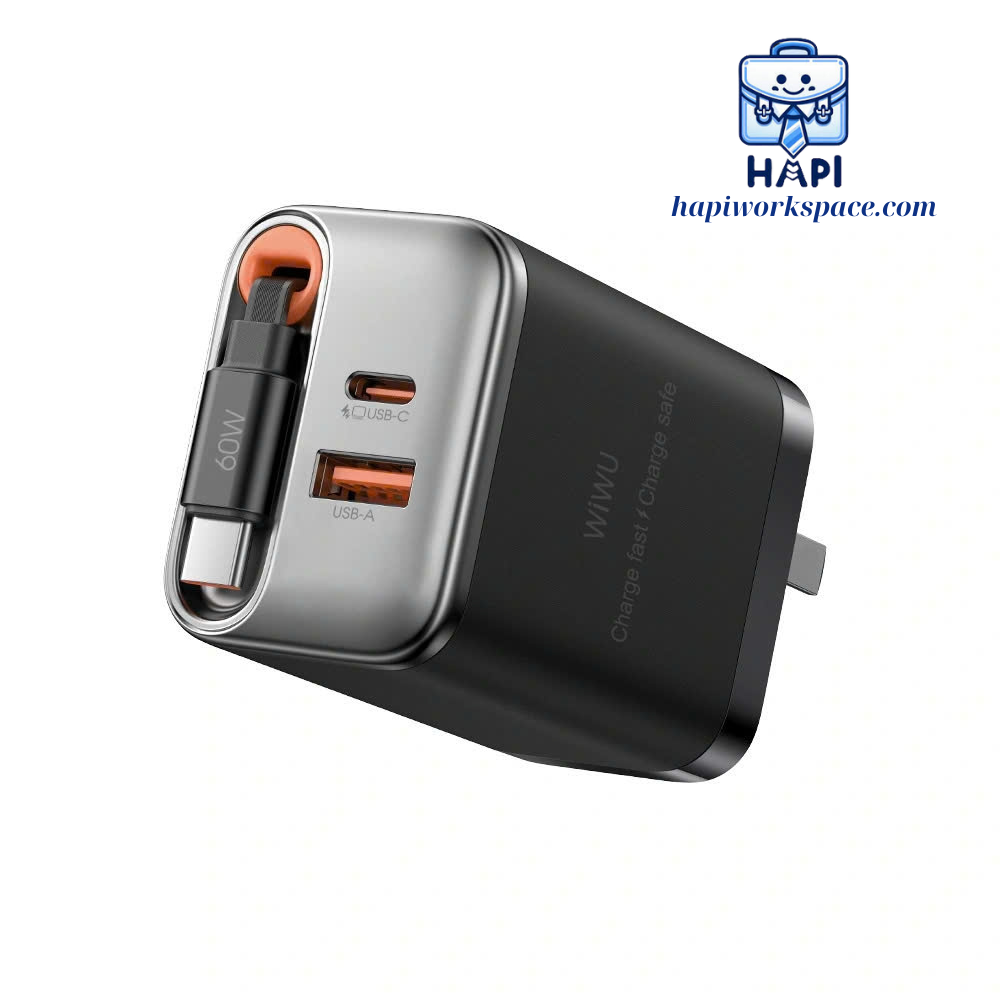 Mua tại TiktokPhối màu sản phẩm sang trọng với đen và xám và điểm nhấn màu cam tinh tế. Thiết kế tối giản, phù hợp với mọi đối tượng. Trang bị 2 cổng (1 Type-C và 1 Type-A) phù hợp với công suất, tích hợp cáp sạc tiện lợi. Chất liệu nhựa ABS chống cháy được hoàn thiện chắc chắn, tỉ mỉ ở từng chi tiết, vừa làm toát lên vẻ sang trọng vừa làm giảm đi trọng lượng sản phẩm một cách đáng kể. Kích thước nhỏ gọn vừa phải có thể nằm gọn trong lòng bàn tay. Điểm nhấn đặc biệt với sợi cáp Type-C tích hợp dài 70cm với công suất 60W và khả năng kéo giãn/thu gọn tùy kích thước mong muốn. Không chỉ không cần luôn mang theo cáp sạc, mà còn giúp góc sạc thiết bị của bạn trở nên gọn gàng, tối giản hơn rất nhiều. Cực kỳ phù hợp cho nhu cầu di chuyển cao. Chân sạc dẹt chuẩn US có thể gập gọn, kèm các đầu chuyển ổ cắm, phù hợp sử dụng cho bất cứ nơi đâu. Không chiếm dụng không gian lưu trữ. dễ dàng bỏ vào balo, túi xách, túi đeo chéo hay thậm chí là bỏ túi quần dễ dàng. Chip chia điện thông minh giúp WiWU Helix 67W GaN có thể sạc được 2 đến 3 thiết bị cùng lúc mà tổng công suất không bị ảnh hưởng đáng kể. Xứng đáng là một "trợ thủ năng lượng" đắc lực cùng bạn đi đến bất cứ nơi đâu. THÔNG TIN CƠ BẢN