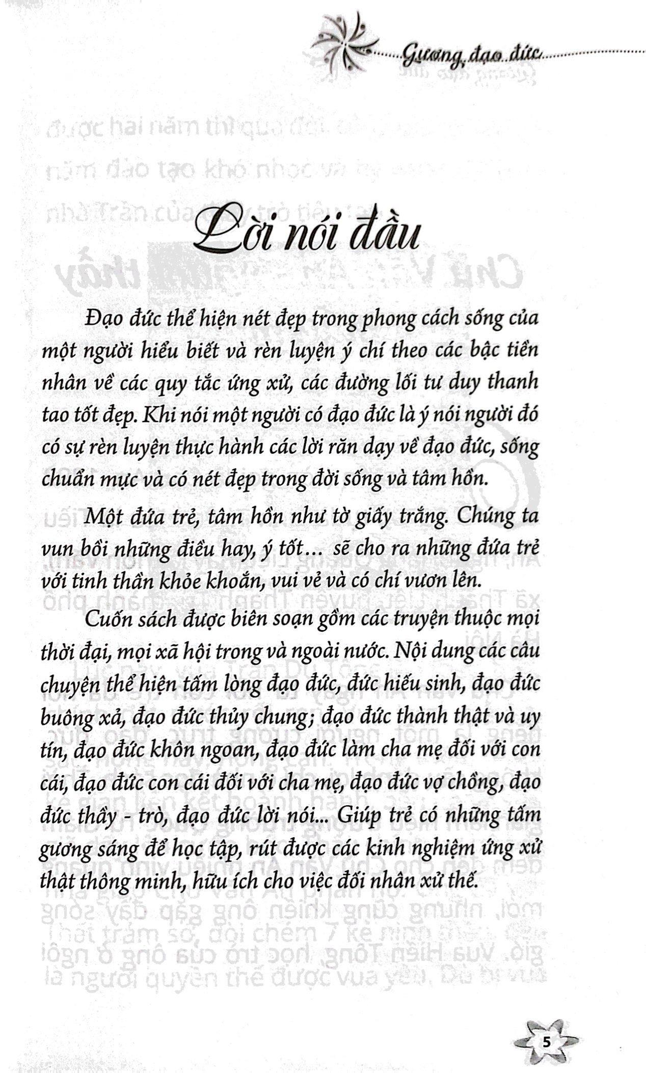 Cuốn sách được biên soạn gồm các truyện thuộc mọi thời đại, mọi xã hội trong và ngoài nước. Nội dung các câu chuyện thể hiện tấm lòng đạo đức, đức hiếu sinh, đạo đức buông xả, đạo đức thủy chung; đạo đức thành thật và uy tín, đạo đức khôn ngoan, đạo đức làm cha mẹ đối với con cái, đạo đức con cái đối với cha mẹ, đạo đức vợ chồng, đạo đức thầy - trò, đạo đức lời nó Giúp trẻ có những tấm gương sáng để học tập, rút được các kinh nghiệm ứng xử thật thông minh, hữu ích cho việc đối nhân xử thế.