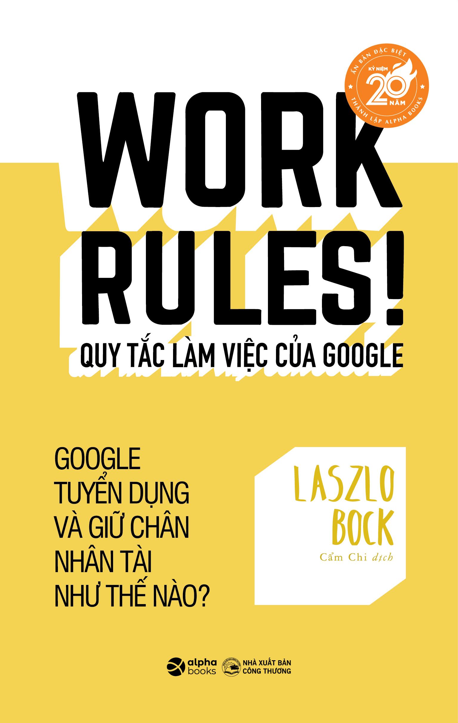 "Quy Tắc Làm Việc Của Google" của Laszlo Bock là một cuốn sách đáng đọc dành cho những ai quan tâm đến việc quản lý nhân sự, xây dựng văn hóa doanh nghiệp và cải thiện hiệu suất làm việc. Laszlo Bock, cựu Phó Chủ tịch cấp cao phụ trách nhân sự của Google, chia sẻ những bí quyết và nguyên tắc đã giúp Google trở thành một trong những công ty đáng mơ ước nhất để làm việc trên thế giới.