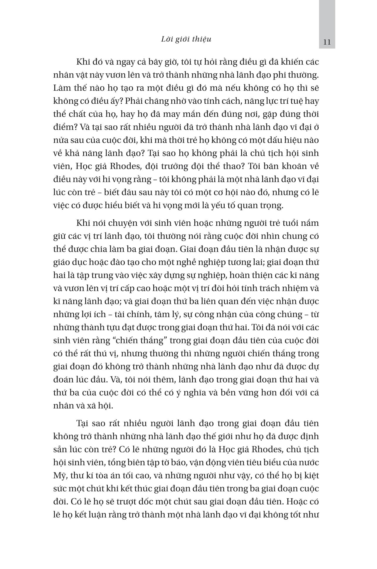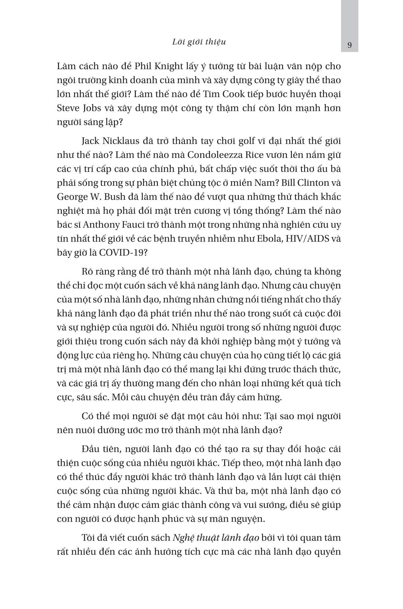 Cũng theo ông, từng nhân vật được phỏng vấn trong cuốn sách giống như một tấm gương phản ánh hành trình dẫn lối họ trở thành nhà lãnh đạo đỉnh cao và những khó khăn chông gai trên con đường đó, không có cái nào là vô nghĩa hay phí hoài cả. “Bạn có thể thành công đến mức nào, bước lên đỉnh vinh quang cao đến đâu, có năng lực chiến đấu khi bị khó khăn vây bủa và đạt được phần thưởng là hạnh phúc đi kèm với thành công hay không, đều do chính bạn quyết định”.