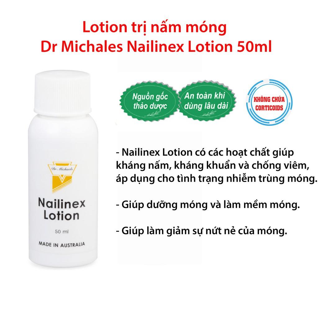 Dr Michaels Nailinex Lotion có các hoạt chất giúp kháng nấm, kháng khuẩn và với công thức được thiết kế để chống viêm, áp dụng cho tình trạng nhiễm trùng nấm móng. Dr Michaels Nailinex